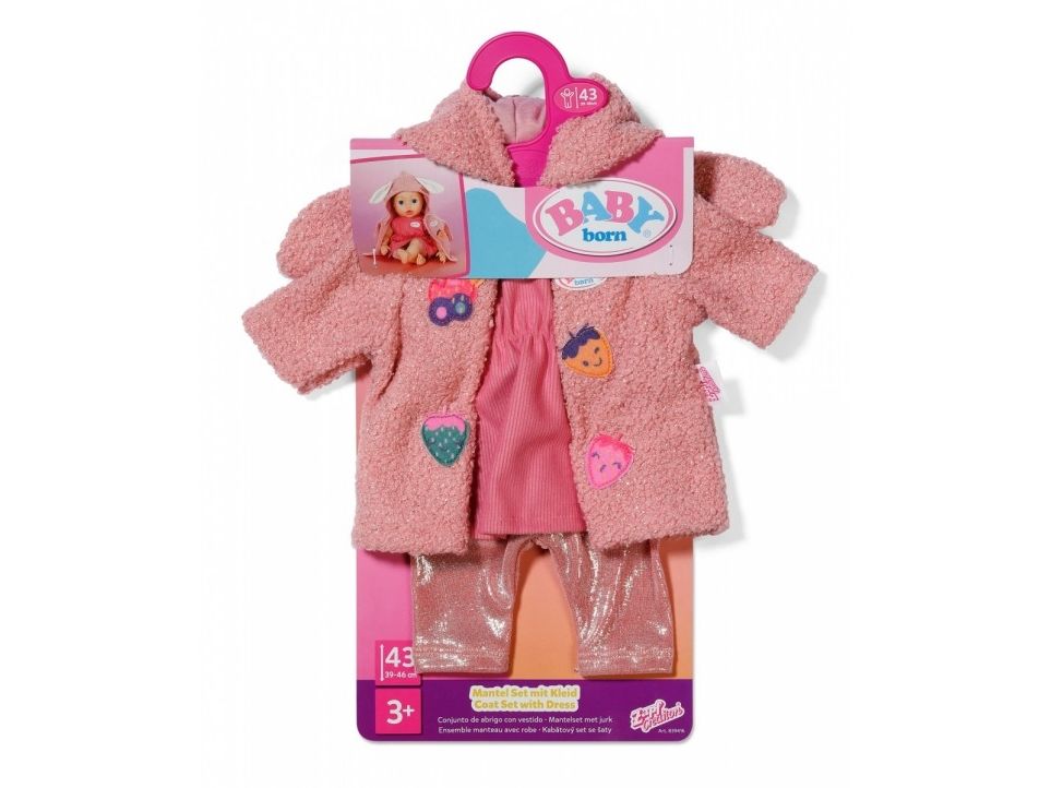The cuddly coat set transforms BABY born into a cute little bunny. The soft, fluffy coat with the bunny ears on the hood and strawberry details not only provides a cute look, but also a warm and cozy feeling on cold days. If it gets warmer, the coat can also be taken off - BABY born wears a matching dress and leggings underneath. An outfit for every season.BABY born Coat Set with Dress 43cm. Product type: Doll clothes set, Recommended age (min): 3 yr(s), Foldable