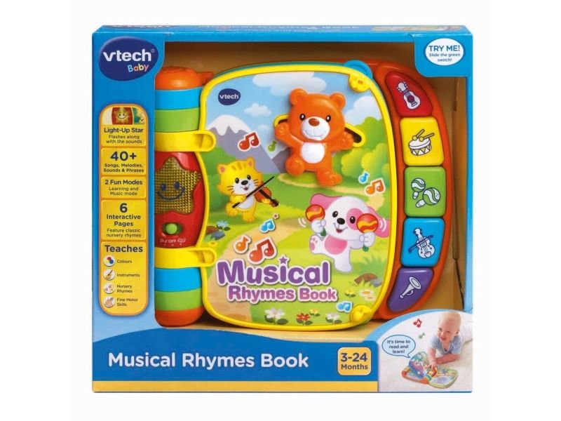 Utforsk klassiske barnesanger med Musical Rhymes Book™ fra VTech®. Familiens yngste vil utvikle motorikken sin ved å skyve og vri på de morsomme delene og samtidig utforske hver av sidene. Deretter kan de spille pianolyder med det fem fargerike pianotangentene som representerer farger og instrumenter. Det er to ulike innstillinger, en for læring med alderstilpasset vokabular og en for musikk som spiller musikk og instrumentlyder. Denne interaktive eventyrboken byr på visuell stimulans med sterke fargede sider og en lysende stjerne som blinker i takt med musikken. Inkluderer 27+ fengende sanger, musikk, lydeffekter og morsomme fraser.