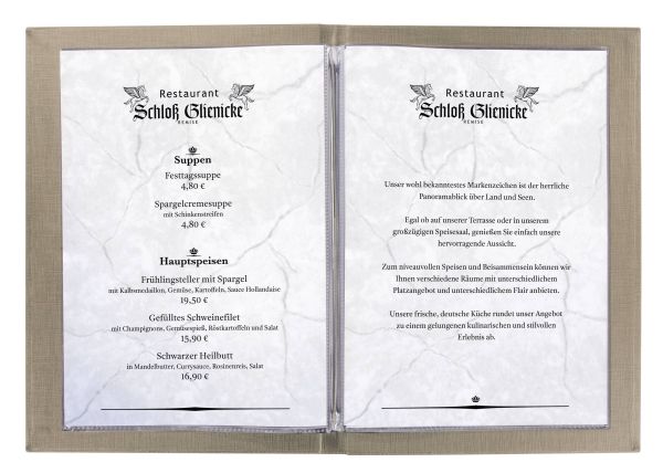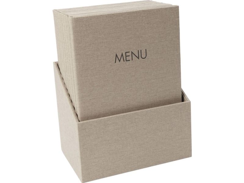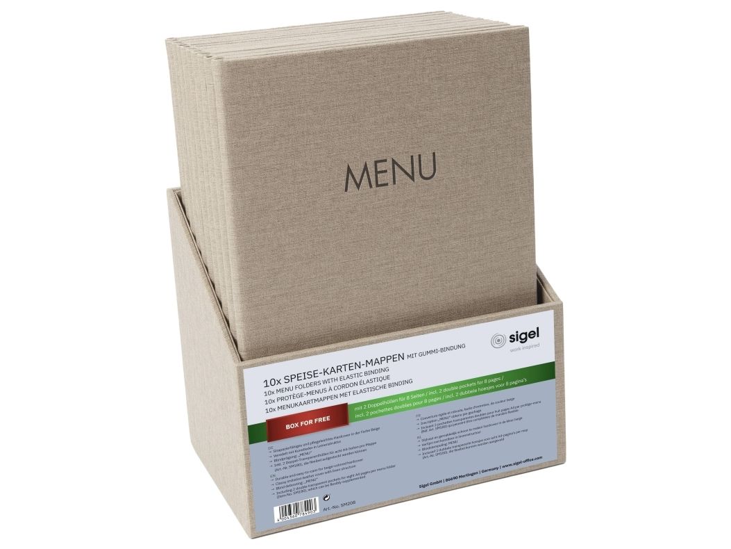 Toll i sæt: 10 stk. tidløse og førsteklasses spisemapper fra Sigel inkl. gratis opbevaringsboks, ideal til daglig anvendelse inden for gastronomien. Spisekort-mapper med gummibinding, beige, passer til A4-format, af førsteklasses materialer: Polyuretan (PU), polypropylen (PP). Inkl. opbevaringsboks gratis.; med international blindprægning: Menu; oplysninger kan nemt skubbes ind og udskiftes igen og igen; slidklart cover med eksklusiv linestruktur, der er let at rengøre; PU-materiale med lang levetid (uden blødgørere), robust over for slid, ridser og slid; Inkl. 2 dobbelte transparenter med i alt 8 sider (yderligere fås til køb)