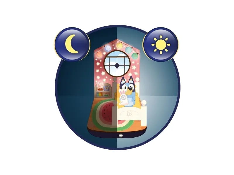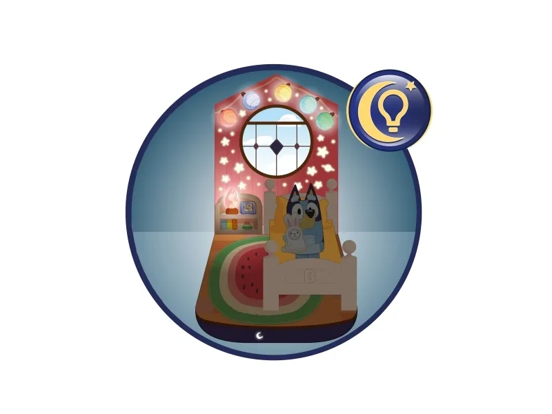 Om natten vil en måne gløde, når det er nat og tid til at blive i sengen, og om morgenen vil en sol gløde for at vise, at det er tid til at stå ud af sengen. Løft Bluey ud af sengen for at forvandle den til en praktisk lygte, der har den perfekte størrelse for små hænder og som hjælper med at finde vej i mørket fra sengen til toilettet eller måske ind til mor og fars seng!