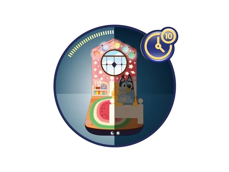 Om natten vil en måne gløde, når det er tid til at blive i sengen, og om morgenen vil en sol gløde for at vise, at det er tid til at stå ud af sengen. Løft Bluey ud af sengen for at forvandle den til en praktisk lygte, der har den perfekte størrelse for små hænder og så hjælper den med at finde vej i mørket fra sengen til toilettet eller måske ind til mor og fars seng!