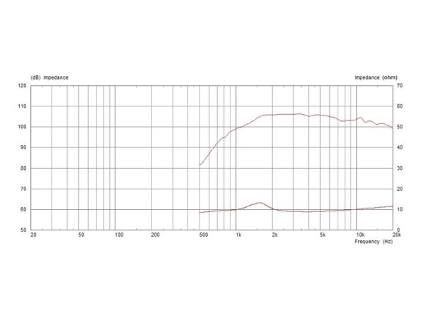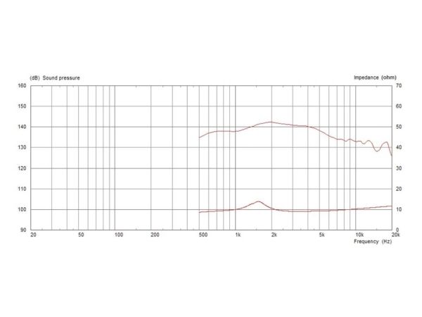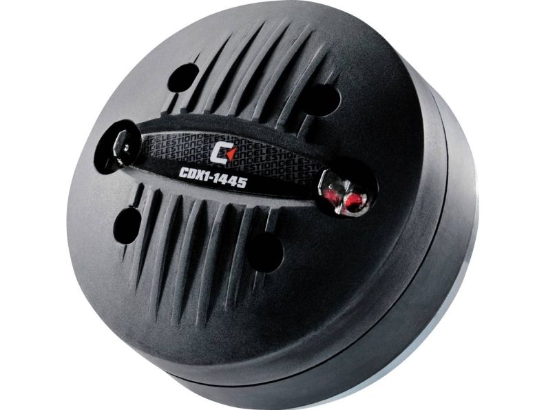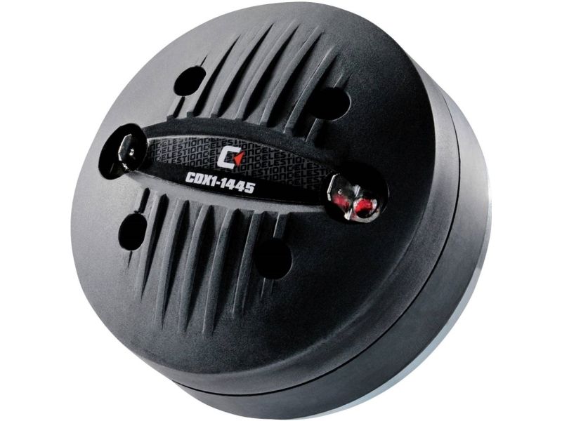 Førsteklasses 25-mm kompressionsdriver (1) med 35-mm svingspole (1,4) og ferritmagnet PETP-membran og -sik integreret membran og afdækning på bagsiden til nem udskiftning af modtaget delefrekvens 2200 Hz (12 dB/oktav) 4-huls-skruemontering også fås som 8-Ω-variant CDX1-1445/8