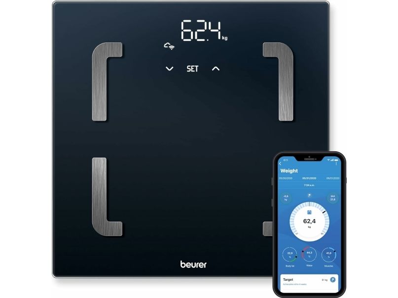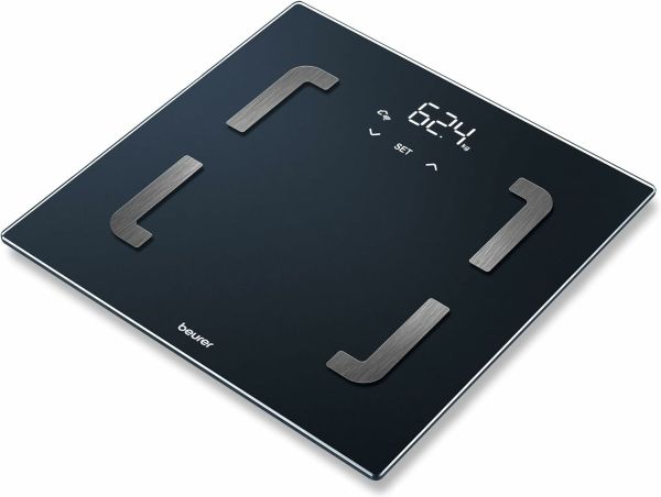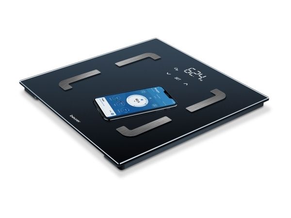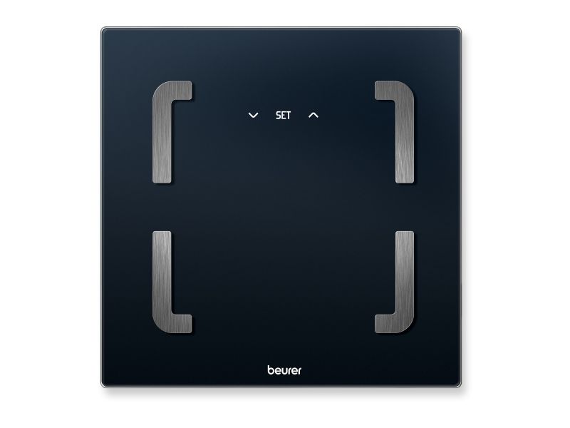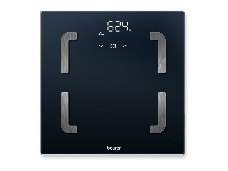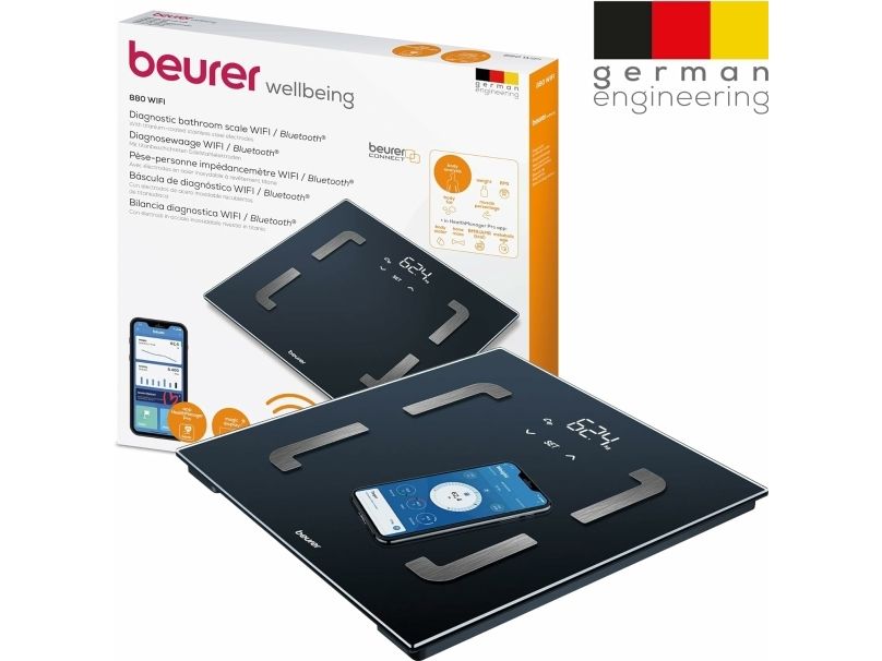 BF 880 Sort kropsanalysevægt. Måler både fedt-, muskel-, og vandprocent, knoglemasse, BMI, metabolisk alder og dagligt kalorieforbrug. 8 brugerhukommelser. Med WiFi og Bluetooth, og tilhørende Beurer HealthManager Pro app. Knapper på vægten til betjening uden app. Kapacitet på 180 kg. Titanium-belagte elektroder. Mål: 30x30 cm. Magisk LED-display (kun synligt ved vejning) med cifferhøjde på 28 mm. 3 x AA-batterier medfølger