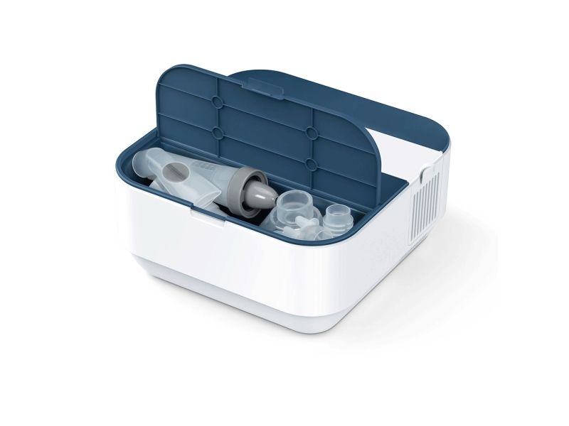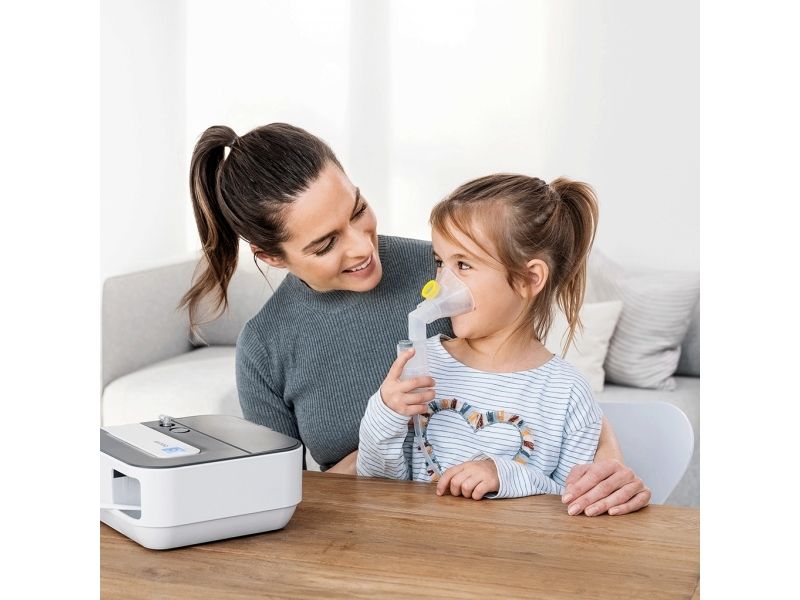 IH 28 Inhalator med kompressorforstøvning. Til forstøvning af flydende medikamenter til luftvejene. Ekstra lang slange. Inkl. voksen- og barnemaske, vinkeltilbehør, 10 filtre samt mund- og næsestykke. Partikelstr.: 3.07 μm. Høj forstøverkapacitet: 0,35 ml./min. Tryk: 0,5 - 1,45 bar. Næseskyldeflaske medfølger.