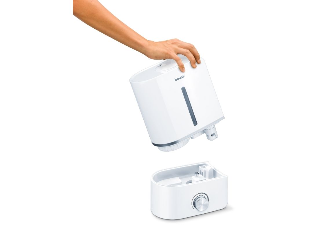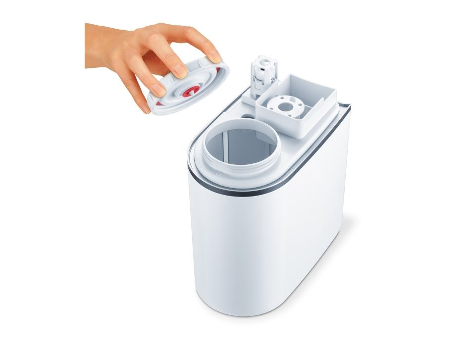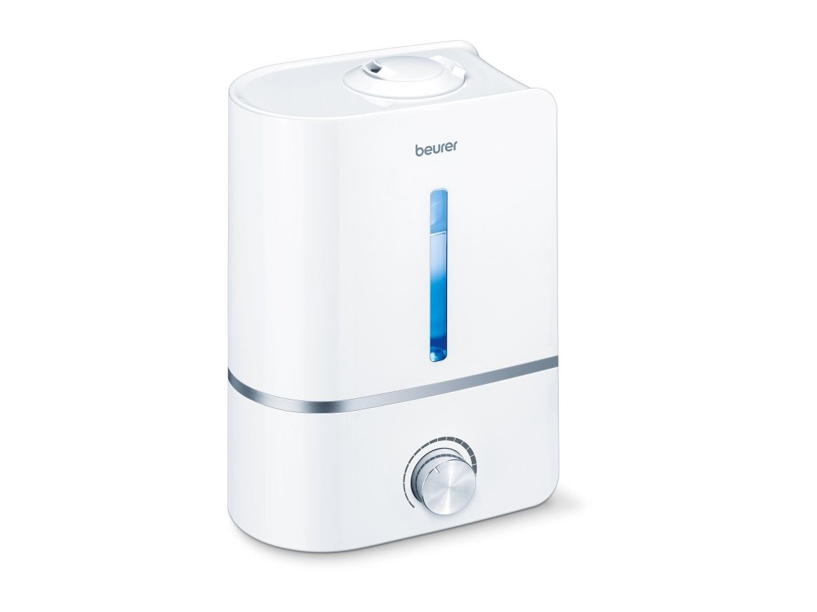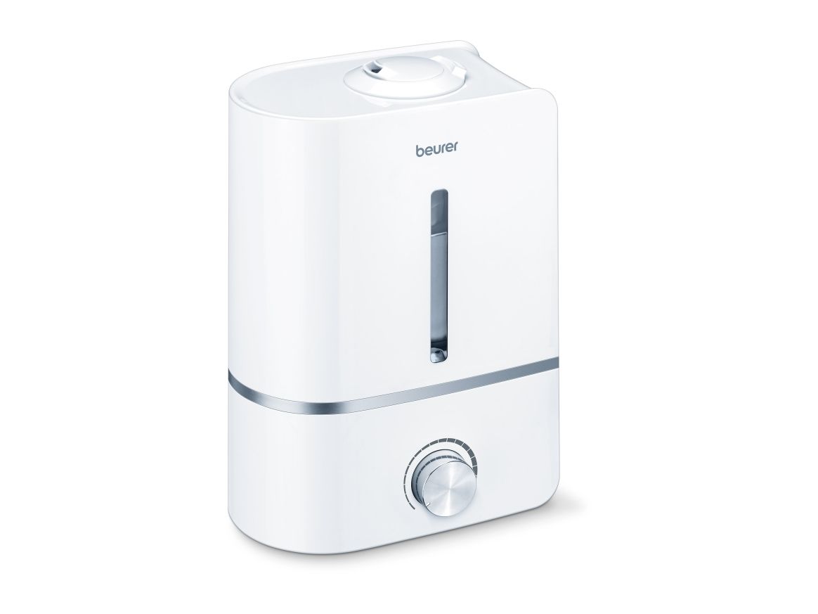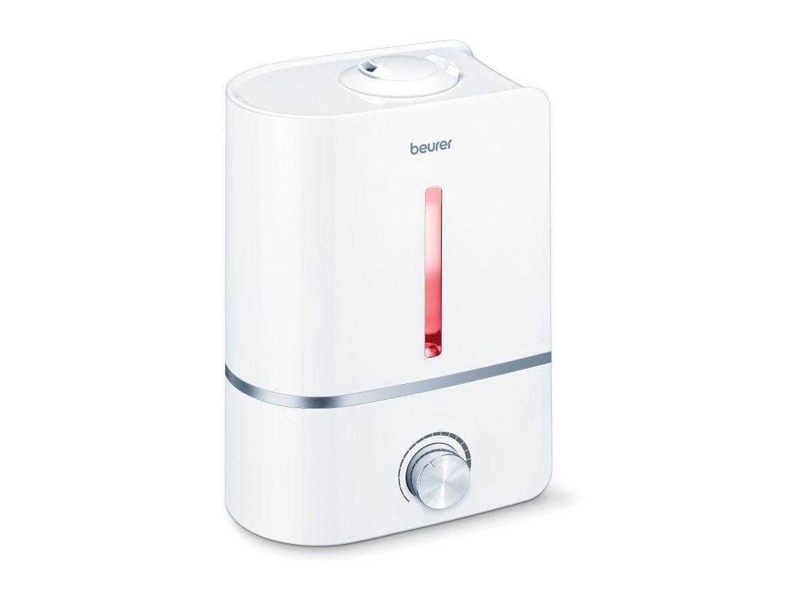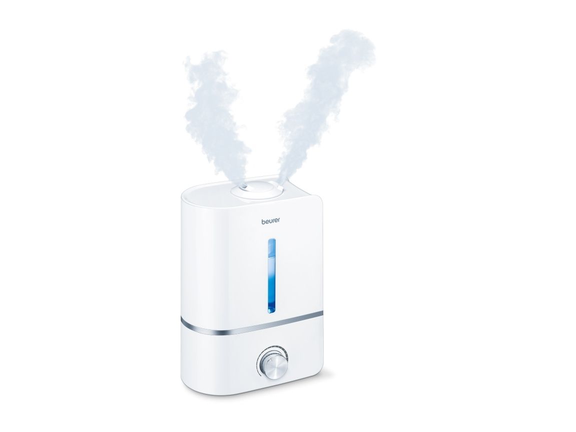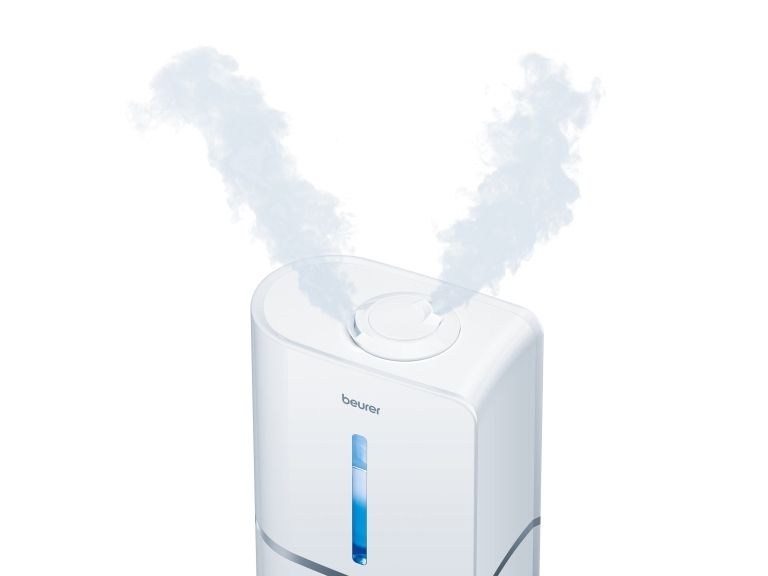 LB 45 Luftbefugter med ultralydsforstøvning. To 360° drejbare dyser. Kan bruges i rum op til 30 m². Kapacitet: 4 l. Max. befugtningsrate: 300 ml/h. Trinløs justerbar hastighed. Kan også bruges med vandopløslige aromaolier. 15 aromapads medfølger.