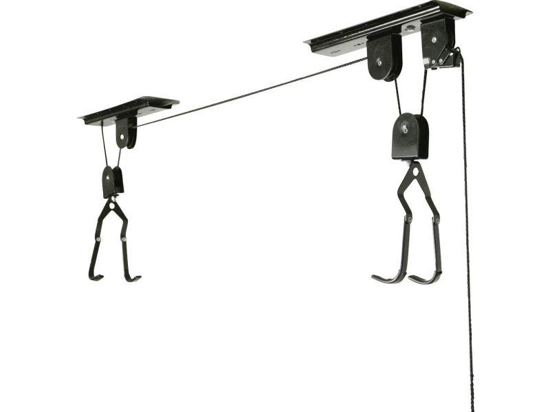 Cykellift Plus 30 kg bæreevne Med FISCHER-lift Plus er den pladsbesparende opbevaring af et hjul under loftet mulig. Cykelløft er baseret på princippet om flasketrækning. Hjulet på sadlen og førerhuset hænges op med 2 kroge og trækkes derefter op med muskelkraft. Takket være de gummierede kroge opstår der ingen ridser i lakken eller på andre områder af cyklen. Et håndtag gør det lettere at trække hjulet op eller lade det ned. FISCHER-cykellift er designet til en totalvægt på op til 30 kg. Dermed kan du ud over alle gængse cykler også trække e-bikes eller Pedelecs op, der forbliver under denne vægtgrænse. Takket være det omfattende tilbehør er limens fastgørelse i loftet nem og sikker. De nødvendige skruer og dyvler medfølger i leveringen. På denne måde kan FISCHER-lift installeres i lofter af træ, sten eller beton. En garage eller kælder er passende områder for anvendelsen af liften. Systemet er designet til lofthøjder på op til 4 m. En god opbevaring under loftet er især under den kolde årstid. På den måde optager cyklen ikke en vigtig opbevaringsplads, når den ikke bruges.