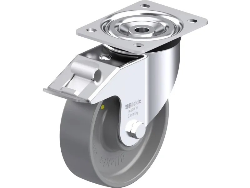 • Stålplade, galvaniseret, blå passiveret, Cr6-fri • Dobbelt kugleleje i drejekransen • Stabil mellembolt (fra hjuldiameter 150 mm) • Drejekranstætning • Minimal drejekransspil, letløbende løb, lang levetid takket være den specielle dynamiske Blickle-belastning