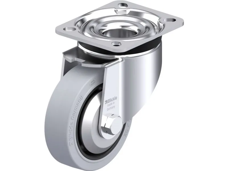 • Dæk: Førsteklasses elastisk, massivt gummi Blickle EasyRoll i letløbskvalitet, hårdhed 65 Shore A, farve grå, uden spor
