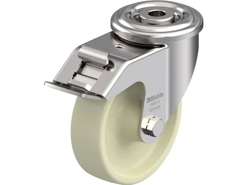 Varmebestandigt styrehjul i rustfrit stål LIXR-POH 100G-FI-OF Varmebestandigt styrehjul i rustfrit stål med ryghul, med bremse top-fix, Hjul af polyamid