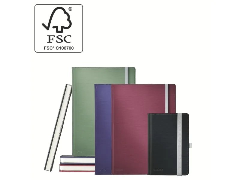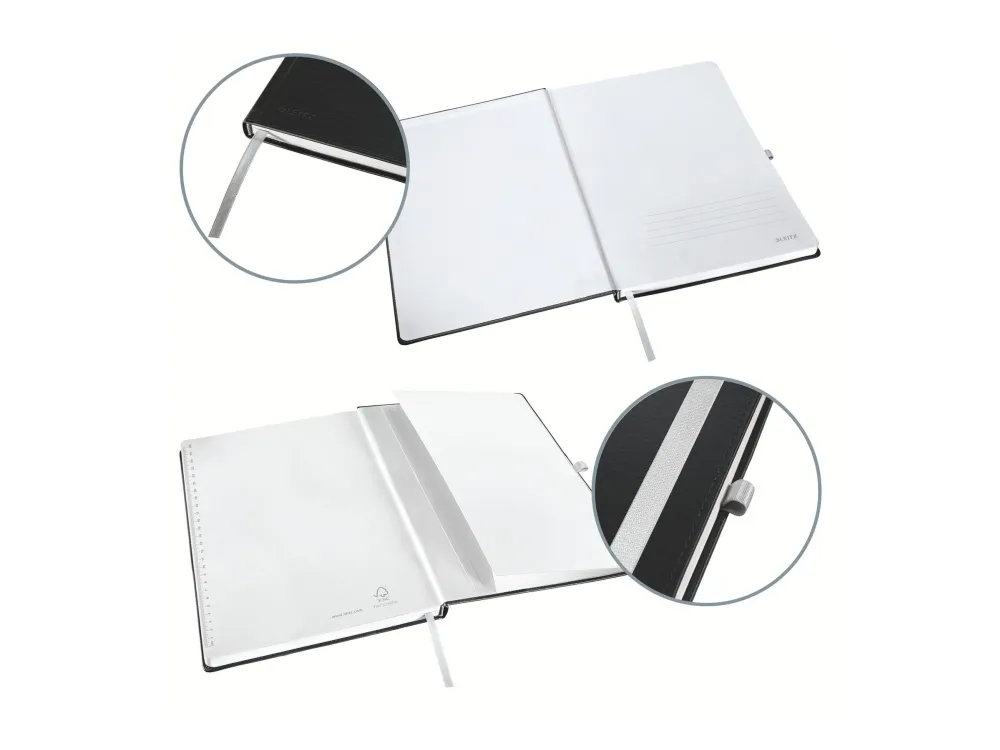 The Leitz Style notebook combines functionality with elegance, featuring a stylish satin black casebound cover. Crafted from FSC certified paper, this A5 notebook offers 80 sheets of ivory lined paper, perfect for note-taking and creative writing. An elastic band closure keeps your notes secure, while a back cover inside pocket and pen holder ensure that tools are always within reach. Additionally, a bookmark and eight perforated sheets at the end provide versatility, making it an ideal companion for both work and study.