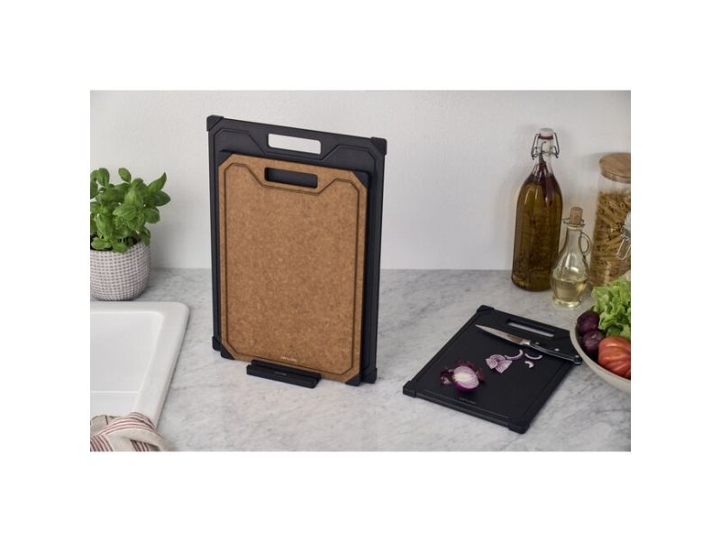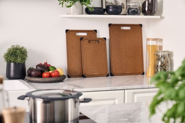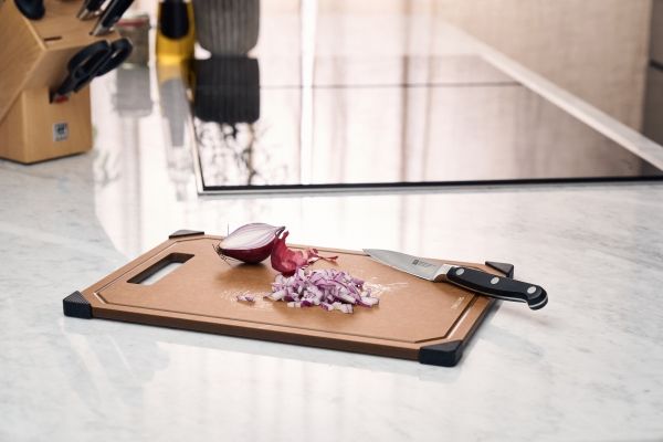 Opdag et uundværligt køkkenredskab: skærebrættet fra ZWILLING. Med det moderne design af det elegante trælaminat bringer dette skærebræt stil og funktionalitet ind i dit køkken. Det ekstra tynde design gør det nemt at håndtere og sparer plads. Skærebrættet er skånsomt mod dine knive, da overfladen let ridses, når du skærer. Det er robust og varmebestandigt, så det kan klare selv det hårdeste arbejde. Den praktiske saftrille på den ene side forhindrer, at væske løber over, og sikrer renlighed, når der skæres. Brættet tåler desuden opvaskemaskine og er nemt at rengøre. De skridsikre silikonefødder giver et sikkert greb på enhver overflade, så skærebrættet altid ligger stabilt.