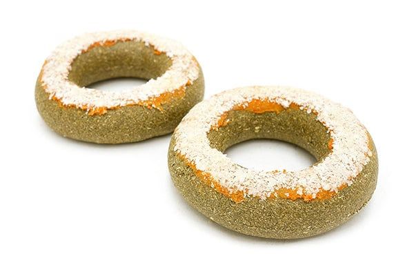 Donut-ring af gnavetræ til kaniners leg - og med smag af bl.a. kokos Lavet af naturligt træ, blandet med lucerne og andre vegetabilske ingredienser og presset til en dejlig stor donuts. Den velsmagende topping er lavet af gulerod og kokos.