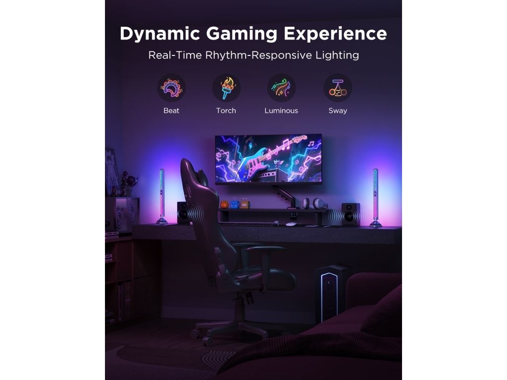 Immersive gaming dynamic RGB lighting, intelligently syncs with on-screen colors, 16 million customizable hues. One-tap preset modes, magnetic mount compatible with PC. Elevates ambiance, boosts gaming immersion and competitive edge. Three-Sided Illumination: Lamp beads, featuring 16 million colors with high accuracy and brightness, diffuse the reflection of wall-washing to create an immersive lighting environment. Cyberpunk-Inspired Design: High-quality PC material and metal texture with a coating process, making it sturdy and durable. Real-Time Screen Color Sync: Synchronize ambient lighting based on your screen content through Govee Desktop (Windows only) or a Govee color-picking device. • Dynamically match the color changes in games, movies, and videos, creating an immersive scene experience. Smart Voice Control: Compatible with Matter, Google, Alexa, Razer, Corsair, and other ecosystems, realizing real-time interaction with devices in a scene. Rich Preset Scene Modes: 60+ preset scene modes and 8 preset music modes with a built-in microphone, allowing the light to change color and brightness as per the beat and rhythm of the music, bringing immersive sound and light interactive displays.