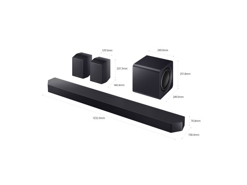 Lydbjelke: 123.2 cm x 13.8 cm x 70.8 cm / 7.3 kg Bakkanalshøyttaler: 12.95 cm x 14.04 cm x 20.13 cm / 3.4 kg Subwoofer: 24.9 cm x 24.9 cm x 25.18 cm / 8.3 kg