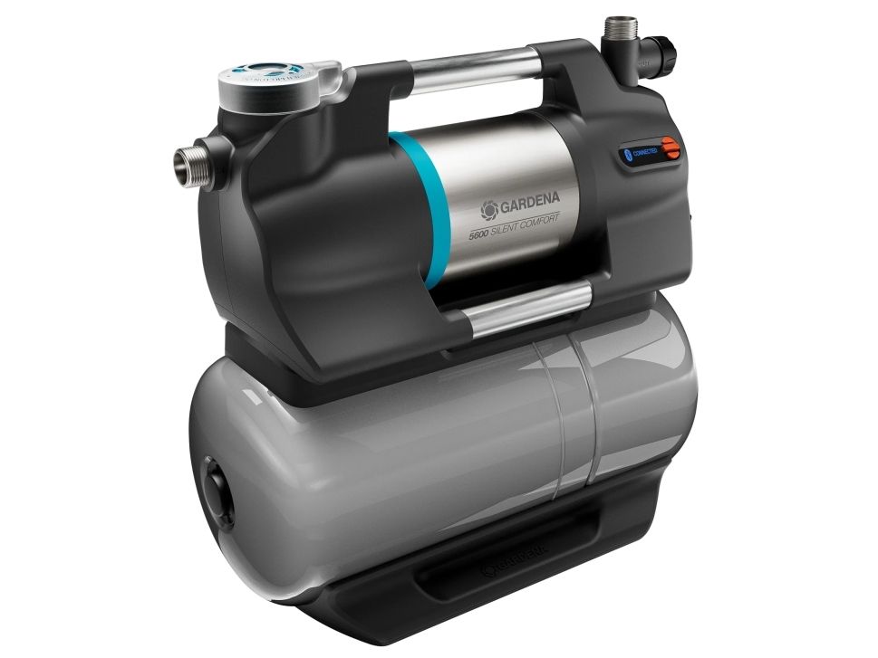 Exceptionally low-noise premium model with Bluetooth and Power Boost function Introducing incredibly low noise level pumps with Bluetooth irrigation control, delivering more power. The GARDENA Pressure Tank Unit 5600 SilentComfort brings you the ideal solution for automated water supply in your home and garden. The pressure pump is extremely powerful with a delivery head of 47 m (4.7 bar) and a flow rate of 5600 litres per hour. The high efficiency of this Booster Set is demonstrated by the modest power consumption of only 900 watts. It can draw water from a depth of up to 8 metres. Use the pump to automatically distribute free of charge service water from a rain barrel, well or cistern to the house and garden for applications such as flushing the toilet or supplying water to the washing machine. The Pressure Tank Unit switches on automatically depending on the water demand and then switches off again. Since it can access the water from the large 25-litre storage tank, it operates extremely quietly and cost-effectively. The SilentComfort pressure tank unit, developed in Germany, is exceptionally quiet with an output of only 42 dB(A) sound pressure in 5m distance. This low noise is possible thanks to the innovative, water-cooled multi-stage technology. This technology doesn’t need a fan, as cooling is done through the water, ensuring maximum efficiency and minimum noise. Except for the creation of a watering schedule, you can set useful functions via the illuminated LCD screen on the unit, and start or stop it. As a practical alternative to manual operation, you can operate the pump via Bluetooth with a smart phone or tablet and control it remotely from up to 10 metres away using the GARDENA Bluetooth app. You can simply access additional functions such as creating watering schedules, even if you are not at home, setting a timer, monitoring the current pressure supply, or adjusting the switch-on and switch-off pressures to your individual needs. Owing to the GARDENA Soil Moisture Sensor’s connection option, an ideal water supply for your plants during pre-programmed schedules is guaranteed and water wastage is prevented because watering schedules will be skipped if the soil is already too wet. Inside the pump’s 25-litre water tank is a high-performance membrane, meaning the tank will be maintenance-free for at least five years. Neither the air needs to be refilled nor the membrane replaced in the tank. The inner membrane of the tank is made of a waterproof, multi-layer liner that protects the housing from corrosion. The integrated coupling between pump and tank is made of stainless steel. This not only makes it particularly durable, but also well-protected and can be installed in compact areas. A ceramic sealing system with double sealing, the dry-running and overheating protection (water and engine), along with the optionally activatable drip-water detection and the integrated fine mesh filter ensure a long service life. The filter prevents dirt particles from getting into the energy-saving pump or its accessories. On request, the pump reminds you to clean the filter and the App assists with the initial start-up with clear step-by-step instructions available in 28 languages. Both the app and the display on the housing show you the digital pressure display. A built-in non-return valve means the Pressure Tank Unit 5600 SilentComfort is ready for use as soon as you take it out of the box. If you want to use the electric pump for watering the garden, for example, you can choose to use the Power Boost function. When activated, it automatically detects an increased water demand and deactivates the intended shut-off pressure of the tank. In this way, the maximum pressure of the pump unit is utilised. The typical domestic pump problem of pressure fluctuations during irrigation is a thing of the past and the performance you are used to from a high-quality garden pump is achieved. After irrigation, the pump automatically switches back to energy-saving tank operation. The durable domestic pump is made of high-quality materials such as stainless steel for the drive shaft and connections as well as the motor and pump housing. One of the two outlets can be rotated by 180°. Thanks to the large filling opening and separate drainage plug, the domestic pump can be filled particularly easily or drained for frost protection. GARDENA offers you a five-year warranty on the Pressure Unit 5600 SilentComfort when you register online. Feel the power of GARDENA pumps. Over 40 years' expertise in domestic, irrigation and drainage use.Gardena Pressure Tank Unit 5600 SilentComfort. Proper use: Drainage, Irrigation, Product colour: Black, Grey, Drive shaft material: Stainless steel. Maximum operating pressure: 4.7 bar, Maximum delivery height: 47 m, Flow rate: 5600 l/h. Power: 900 W, Power source type: AC, Power cable type: H07 RNF. Width: 285 mm, Depth: 575 mm, Height: 580 mm. International Protection (IP) code: IPX4