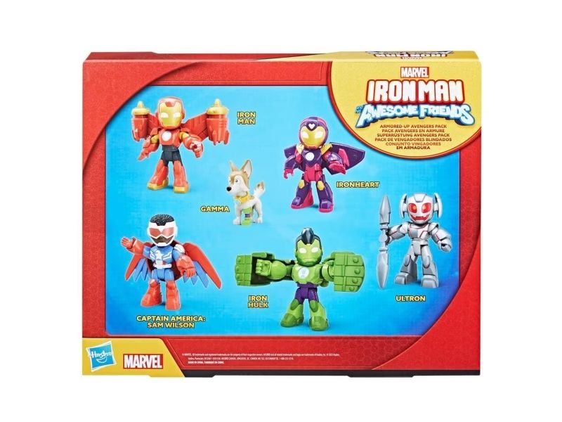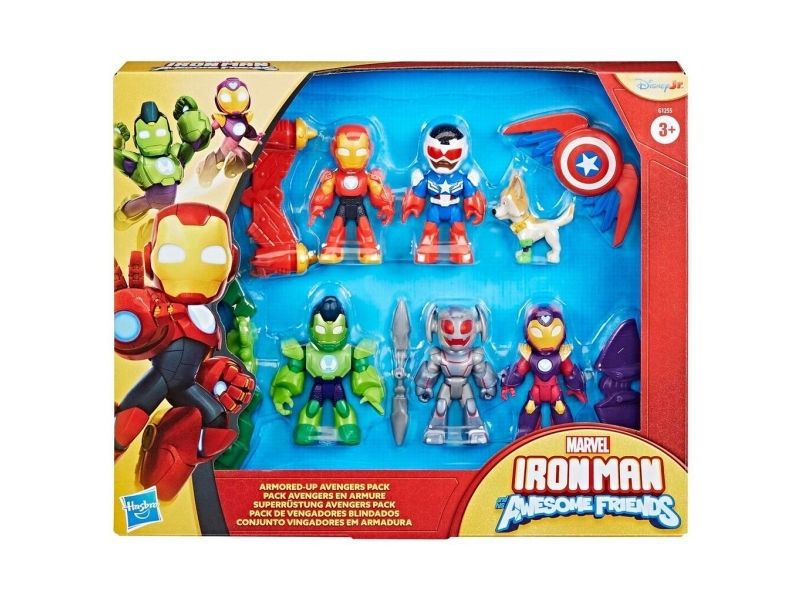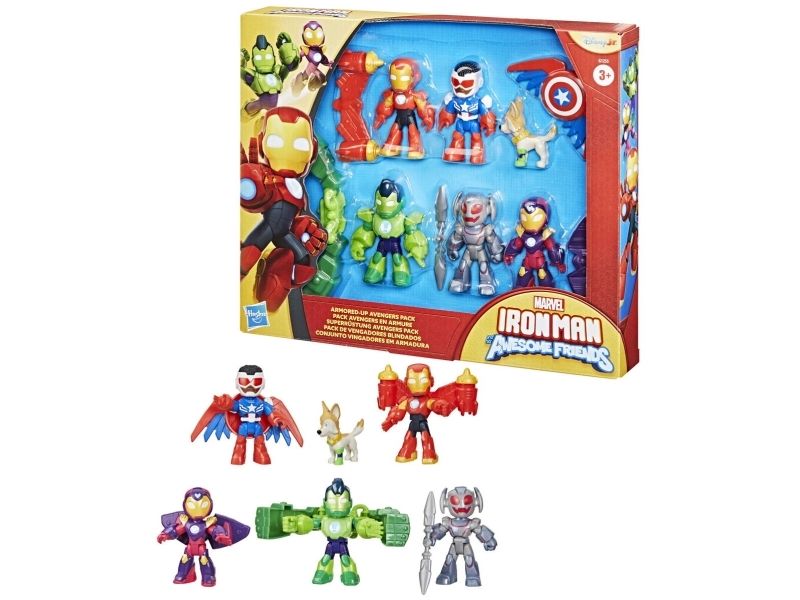 Join Team Iron Man on the latest adventure with this collectible set of 6 Marvel toys. This 3-inch-scale (7.6 cm) 6-figure set of Iron Man toys for boys girls includes 5 Super Hero figures and 1 villain figure, featuring entertainment-inspired design and deco. Imagine Team Iron Man armoring up and saving the day from the baddie Ultron with the included, character-inspired, detachable action figure accessories! Encourage big, imaginative, adventure play for kids ages 3 up with this Marvel toy set! Look for even more Iron Man and His Awesome Friends figures to build an armored Super Hero collection or give as cool Marvel gifts for preschool kids! (Each sold separately. Subject to availability.)Copyright MARVEL. All trademarks and registered trademarks are the property of their respective owners. HASBRO and all related trademarks and logos are trademarks of Hasbro, Inc.