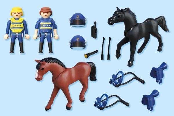 Den kvindelige og mandlige betjent patruljerer gaderne på deres trofaste heste, klar til indsats med radio, lommelygte og aftagelige veste. Hestene er udstyret med sadler og hovedtøj, og betjentene bærer hjelme med visir, der kan vippes op for hurtige kommandoer.