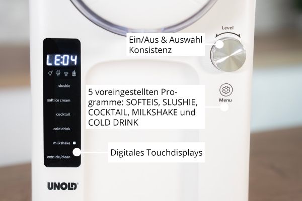 Unold 2in1-Slush und Softeismaschine Sofie 48950. Bowl capacity: 2 L, Display: LED, Cable colour: White. Width: 435 mm, Depth: 226 mm, Height: 442 mm. Power: 150 W, AC input voltage: 220-240 V, AC input frequency: 50 Hz. Package width: 427 mm, Package depth: 284 mm, Package height: 495 mm. Compliance certificates: CE
