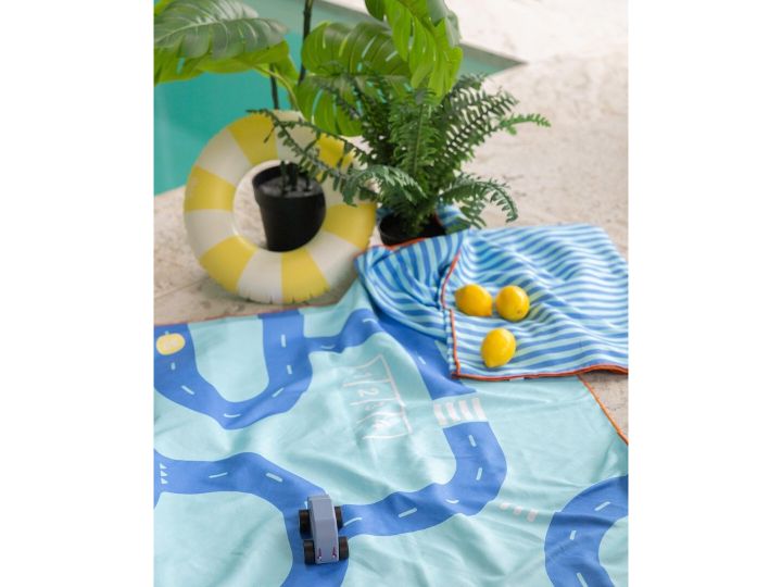 Tag legen med til poolkanten eller ned på stranden med legehåndklæderne fra Quut Toys, der fungerer, som navnet antyder, både som et legeredskab og som et håndklæde. De kommer i forskellige størrelser og med forskellige former for leg eller spil som motiv. Her er det et større håndklæde i størrelsen 180 x 100 centimeter. Det er lavet af mikrofiber, så det er let at have med i tasken, tørrer hurtigt og har høj absorptionsevne. Farverne er lyse og friske - meget klassiske for Quuts univers. Motivet her er en bilbane med alt fra sving til holdepladser, så der er mange timers god leg i vente.