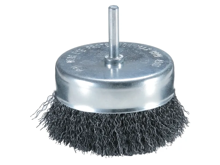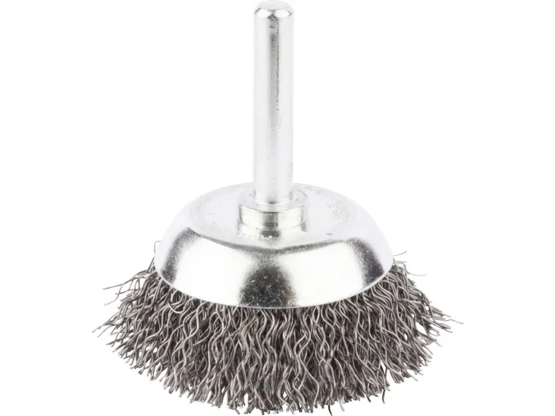 Kopbørster dia. 38 mm med bølget 0,3 mm tykt trådbørster af forzinket stål. Egnet til en blødere slibeydelse og middelstærk børstevirkning på flade og ujævne flader. Med 6-mm-rundskaft-holder.