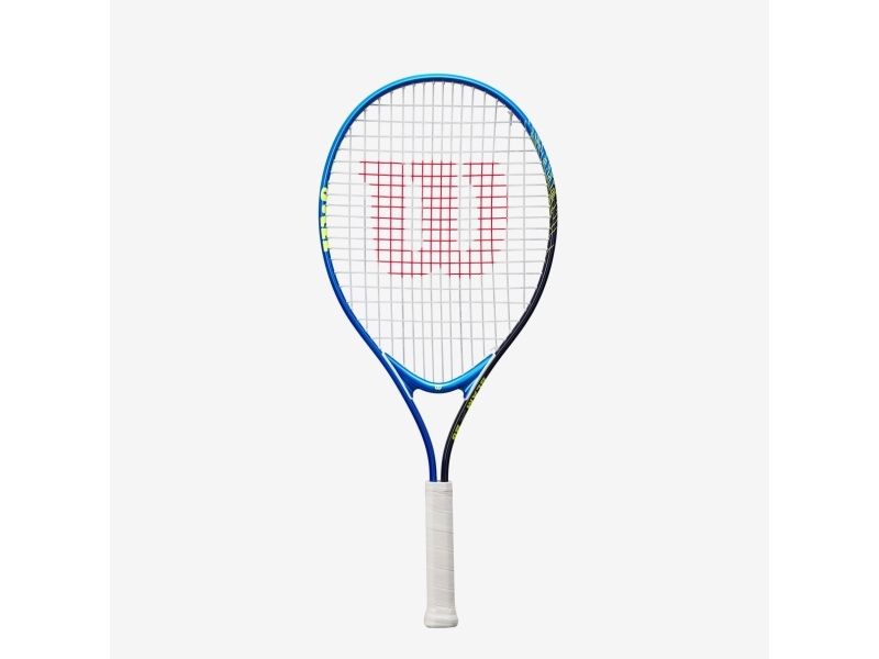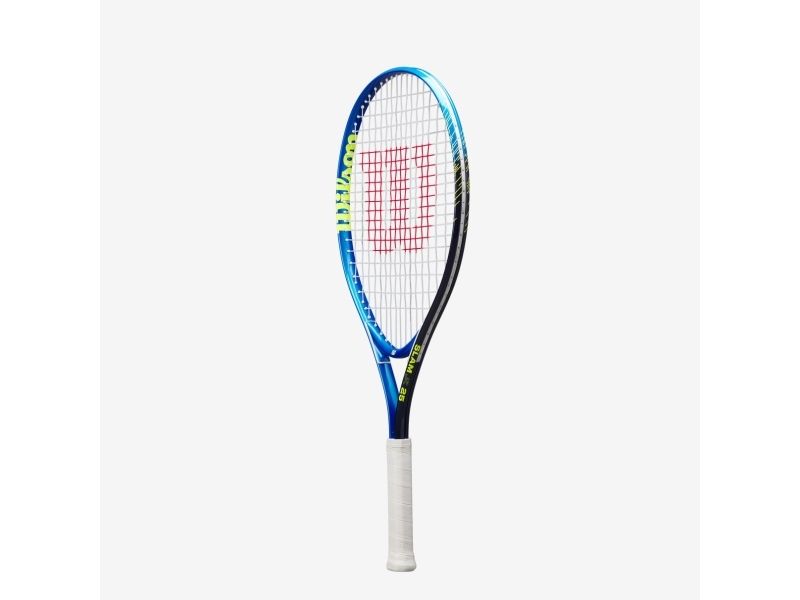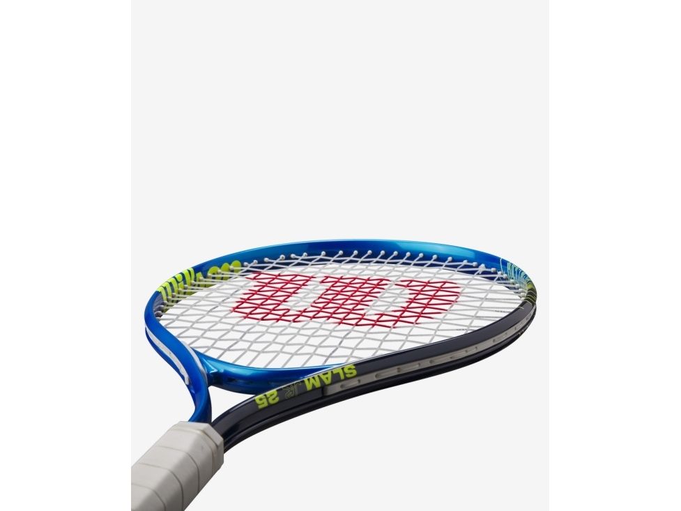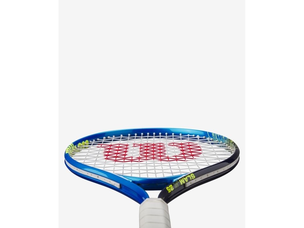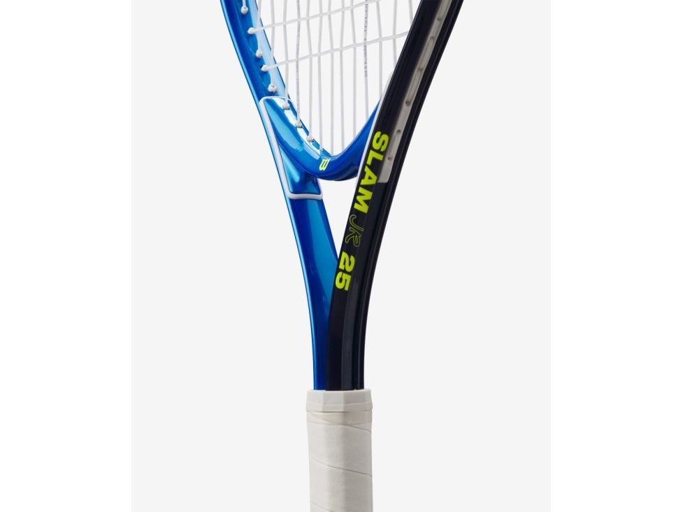 Fun, youth-inspired colors and an easy-to-handle design make Wilson's Slam Jr 25 for junior boys a great starter racket to use while learning the game. Made with an AirLite Alloy aluminum frame, the Slam JR is notable for its lightweight durability and impressive strength. Skill-optimized frame technologies make this racket stable, powerful and easy to maneuver, so new players can experience immediate success when they step onto the court. This bright, lively 25-inch racket comes pre-strung, so it's ready to go right away. Recommended for players aged 9-10.Wilson Slam Jr 25. Product colour: Black, Blue, White, Racket head size: 683 cm², Racket string pattern: 16 x 19. Height: 635 mm, Strung weight: 220 g, Unstrung weight: 205 g. Number of rackets included: 1 pc(s)