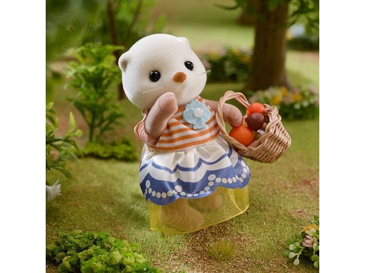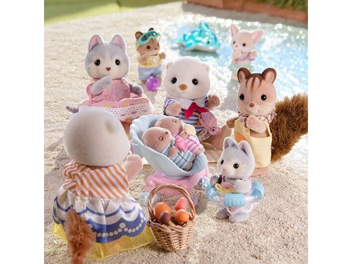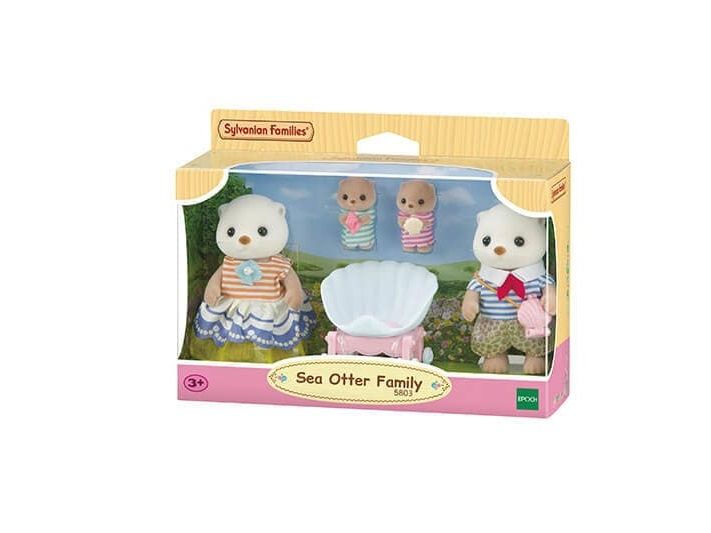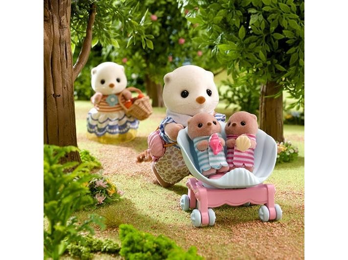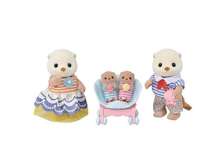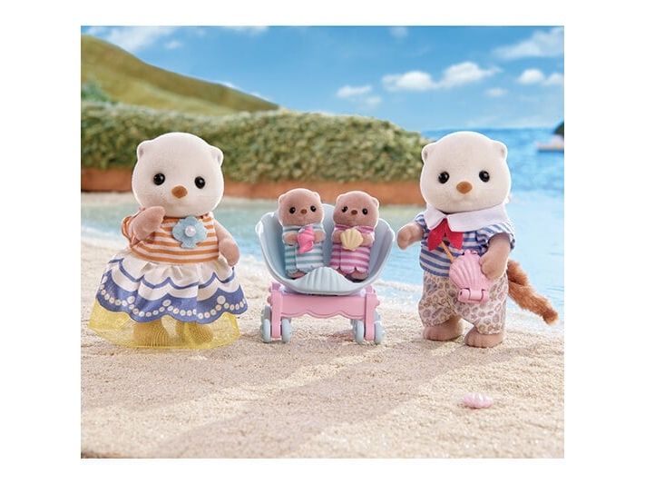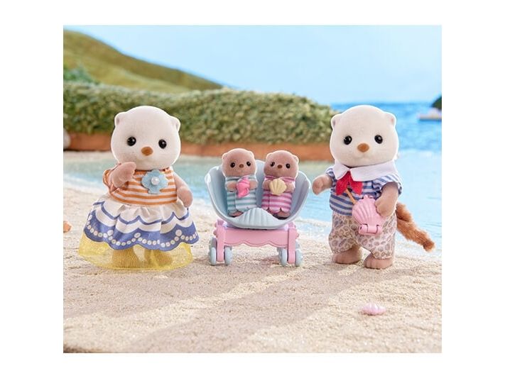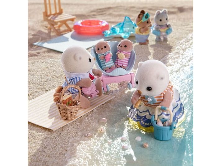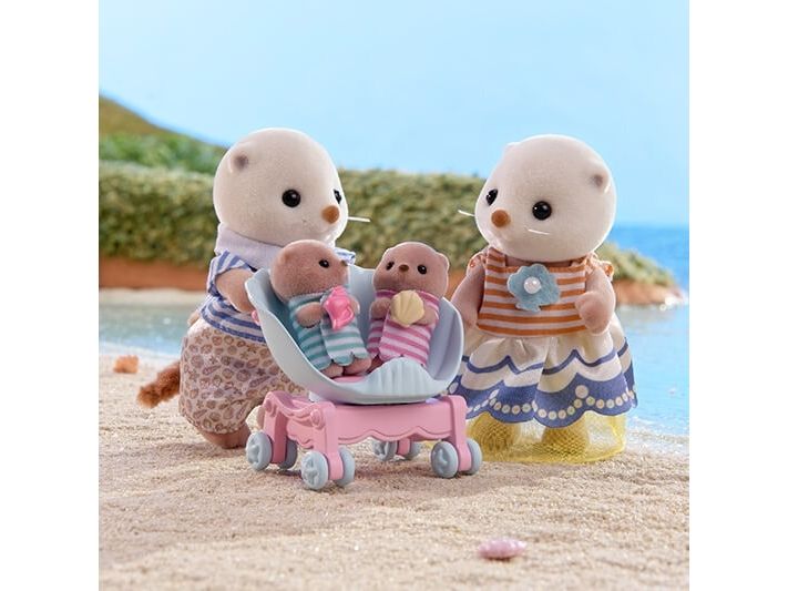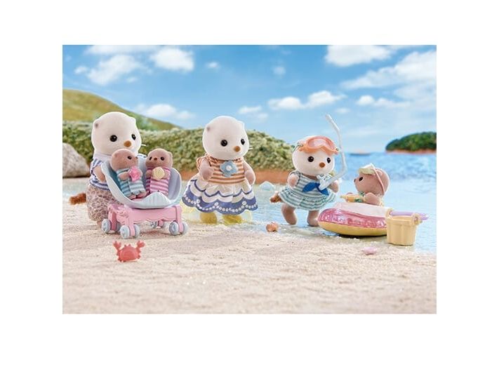 This set includes Sea Otter mother, father and cradled babies wearing outfits with a shell motif, with a pram and a shoulder bag. The Sea Otter family are adorable round characters with small ears and diamond-shaped noses. The two cradled babies can ride in the shell pram. The shoulder bag opens and closes, and has a pearl inside. The cradled babies are holding their favourite shells. Parents arms, legs and head are movable. Clothes can be taken off and put on again. Combine with 5804 Sea Otter Sisters - Splashy Snorkel Set. Suitable for ages 3+.