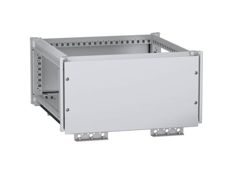 Øverste samleskinnekammer, PanelSeT SFN, til elektrisk kabinet B 600 x T 600 mm, IP55 Denne øvre samleskinnekammer er et strømfordelingstilbehør, der er monteret på PanelSSET SFN's standerkabinet af decarboniseret stål. Den indeholder genvundet stål, der fremstilles med vedvarende energi, hvilket medfører was l-emissioner. Den har en nominel højde, -bredde og -dybde på 300 mm, 600 mm eller 600 mm. Rammen og kamrenes støtter er fremstillet af galvaniseret stål for at sikre en lang levetid. Panelerne er fremstillet af stålplade. En epoxy-polyester-pulverlakering sørger for et plan udseende. Kammeret har en grå (RAL 7035) farve med sort greb (RAL 9005). Det leveres med en tætning, for- og bagvæg og fire øskenskruer. Kammeret har beskyttelsesklasse IP55, det vil sige, den er modstandsdygtig mod indtrængning af støv, vand og olie. Kabinettet er desuden stødfast og har en IK10-klassificering. Betjeningen er nem takket være adgangen bagfra, forfra og fra siden.