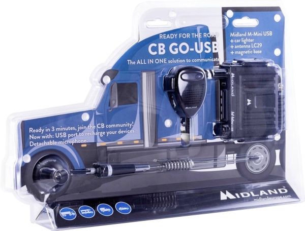Midland CB GO USB - lastbils blister Multi-standardenhed Kanal til/fra-knapper på mikrofonen Kanalsøgning LCD-display, S-meter Automatisk squelch (ASQ) kan indstilles RF-gain Kanal 9/19 tast Tilslutning til ekstern højtaler USB-tilslutning til opladning af mobile enheder Aftagelig mikrofon med RJ45-stik Strømkabel med cigarettænder-stik Midland CB Go USB-sættet består af en Midland M-Mini USB CB-radioenhed, en håndmikrofon, en 12 V bil-oplader med cigarettænder-stik og den kompakte Midland LC29 magnetfod-antenne. Alt er pakket sammen i en formsmuk lastbil blisteremballage og kan nemt hænges op i en reol. Midland M-Mini USB kan anvendes som mobil station i bilen eller med en egnet DC-strømforsyning som basestation. Denne enhed overholder de nyeste europæiske CB-standarder. Via USB-tilslutningen kan mobile enheder som for eksempel smartphones oplades.