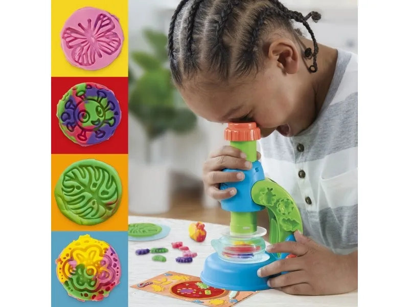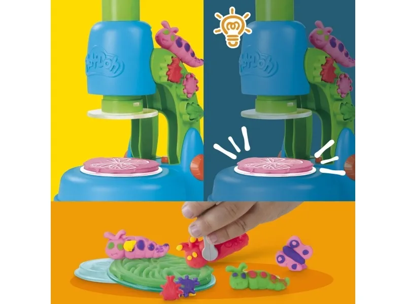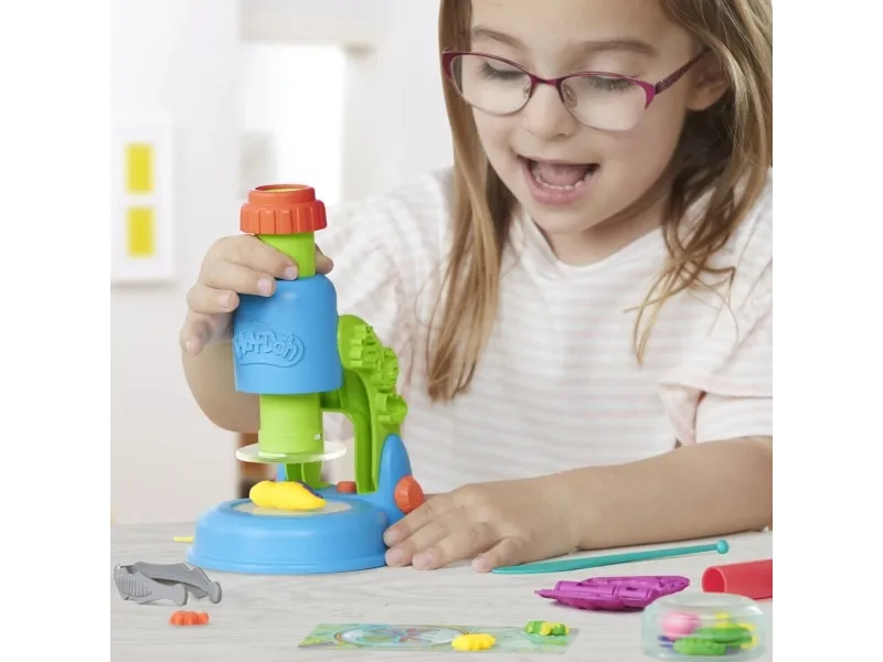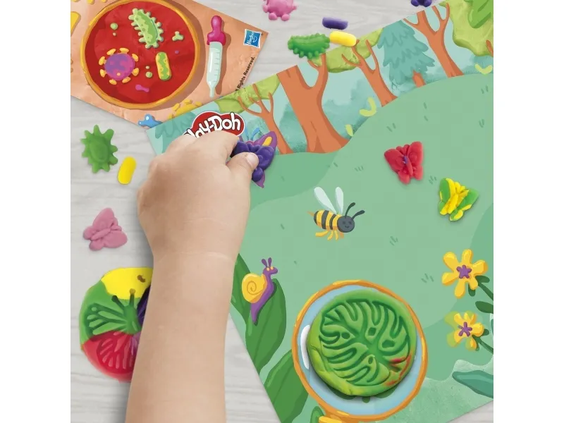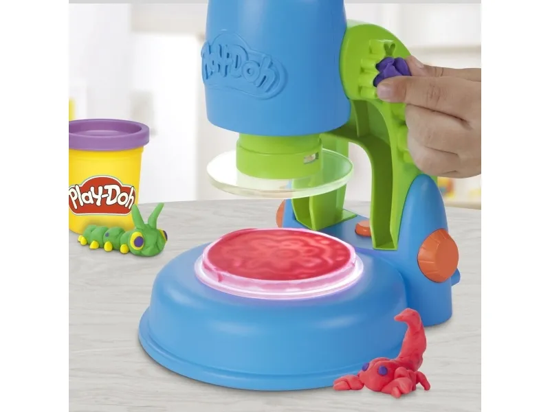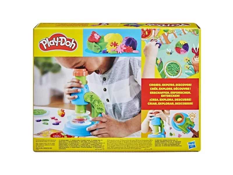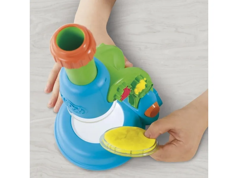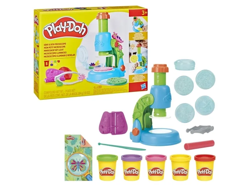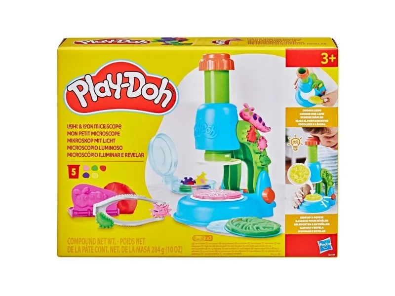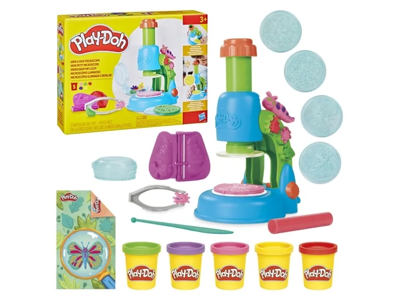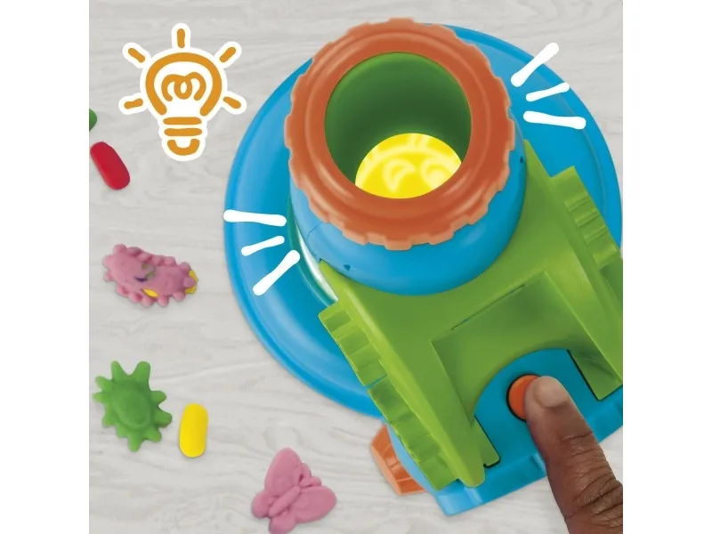 Lad forundring og fantasi skinne igennem med Play-Doh Light and Look Microscope-sættet! Mikroskoplegetøjet kan lyse og føjer en sej stråleeffekt til de Play-Doh-kreationer, som børnene kan lave på de 4 gennemsigtige dias. De skal blot vælge et dias, fylde det med modellervoks og trykke mikroskopet ned for at stemple kreationen og aktivere en sand WOW-effekt! Form farverige Play-Doh-planter, -kryb og baciller, der kan undersøges i petriskålen. Et aktivitetsunderlag med naturtema, 2 aktivitetskort og 5 bøtter Play-Doh-modellervoks giver børnene masser af inspiration til at holde sig beskæftiget og finde på forskellige lege. Dette Play-Doh-sæt føjer hobbyaktiviteter til videnskabslegetøj til børn fra 3 år og er alle tiders gave til både drenge og piger. PLAY-DOH og HASBRO og alle relaterede varemærker og logoer er varemærker, der tilhører Hasbro, Inc.