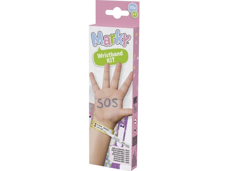 MARKY C169900 - sikkerhedsarmbånd sæt til børn, rivefast, vandtæt, kan mærkes, 10 nød-armbånd og 1 permanent Marky-markør