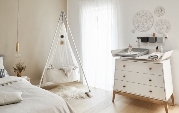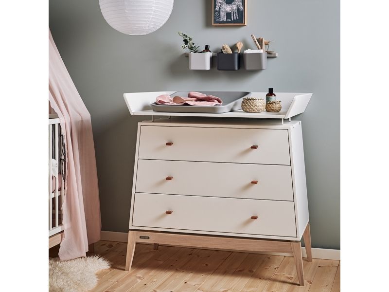 Fløjlsagtig mat finish og bund i massiv eg Forvandl kommoden til pusleplads med Leander Luna™ pusleenheden Kommodens elegante linjer passer også perfekt til stuen