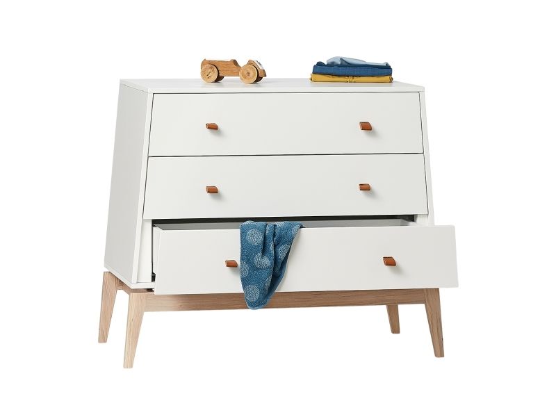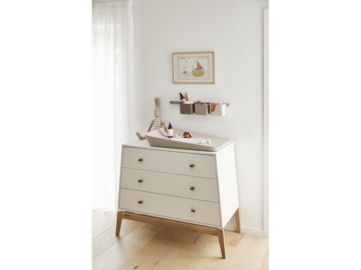 Gode opbevaringsløsninger er et must på børneværelset. Med Leander Luna™ kommoden får du hjælp til at holde orden på værelset. Med tre rummelige skuffer gør kommoden hverdagen til en leg – for dig og dit barn. Kommoden har soft-lukning, der passer de små, nysgerrige fingre, når skufferne åbnes og lukkes. Leander Luna™ kommoden har bløde lædergreb, der nemt kan udskiftes til andre farver eller filt, så du får et udtryk, der passer til din stil. Det lette design passer flot ind på børneværelset men kan også sagtens bruges i entreen eller stuen. Kommodens skrå linjer og den elegante konstruktion giver et let og svævende udtryk, der matcher Leander Luna™-serien. Forvandl kommoden til en smuk og funktionel pusleplads ved at tilkøbe Leander Luna™ pusleenheden eller en Leander Matty™ puslepude.