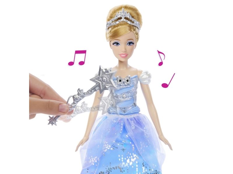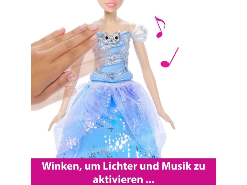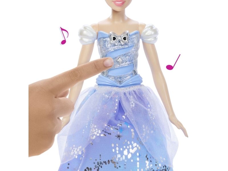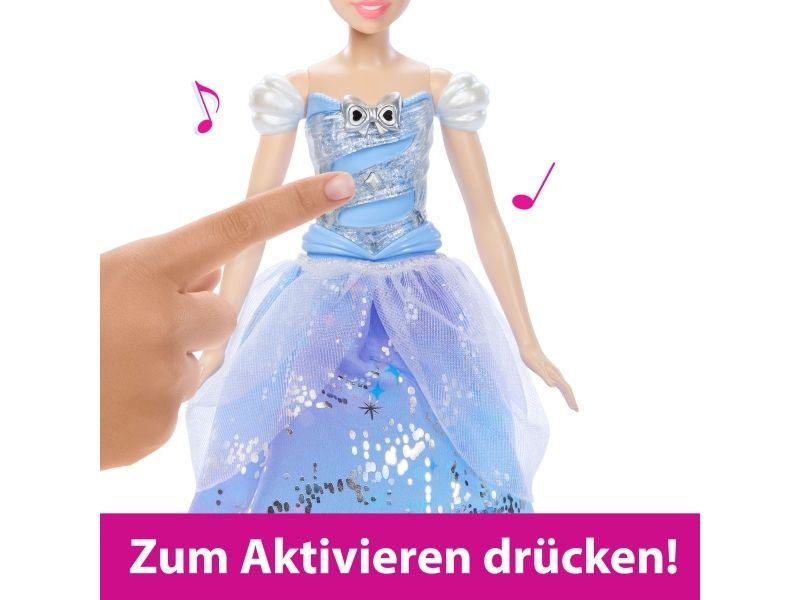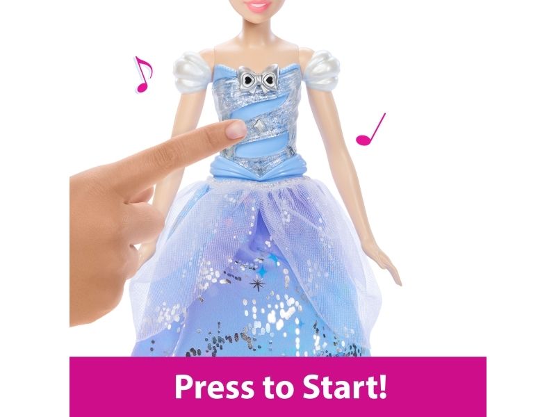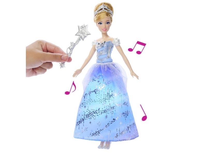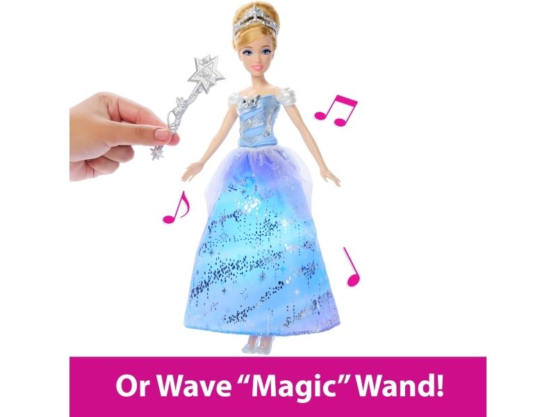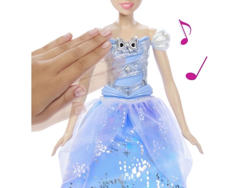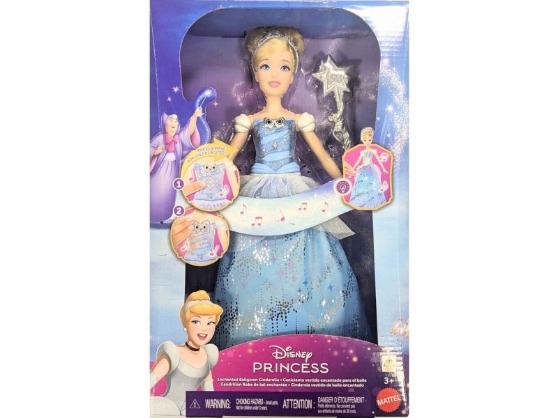 Enchanted Ballgown Disney Cinderella doll recalls the unforgettable Disney movie moment where a wave of a magic wand transforms Cinderella's dress in a swirl of sparkles! Kids can re-create the exciting moment at home by waving the included wand (or their hand) over the Cinderella fashion doll, activating a colourful light show complete with magical sound effects! No magic words required! Doll cannot stand alone. Colours and decorations may vary.Disney Princess Enchanted Ballgown Cinderella Fashion Doll with Lights & Sounds, Inspired by Movie. Doll type: Fashion doll, Doll's gender: Female, Recommended age (min): 3 yr(s), Suggested gender: Girl, Sounding. Battery type: LR44. Height: 255.8 mm, Weight: 148 g. Material: Fabric, Plastic, Product colour: Multicolour