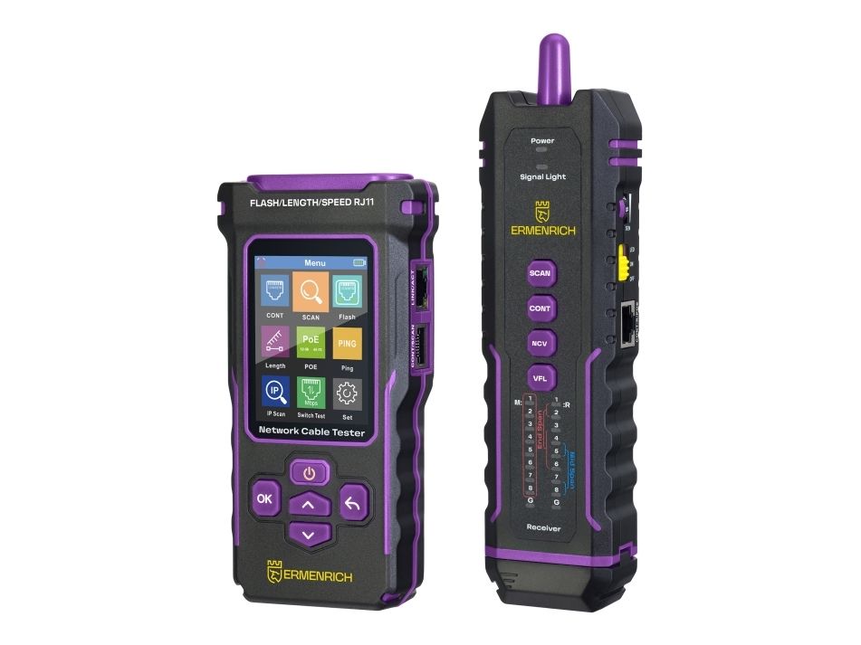 The device has many functions that are useful to specialists who install, maintain, and repair networks in industrial, office, and home environments. Ermenrich NetGeeks NP50 can be used to perform Ethernet network tests: PoE (identifies the PSE type and midspan/endspan) and PING (measure the packet transmission speed, determine the IP address). The Port Flash feature allows you to quickly identify which port on your router or switch your cable is connected to. Using the Visual Fault Locator (VFL), you can locate network faults based on the receiver’s light signals. Light indication is also present in the non-contact voltage detection (NCV) function. All of the diagnostic results are displayed on the transmitter’s color TFT screen.
