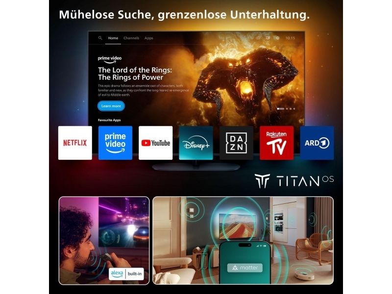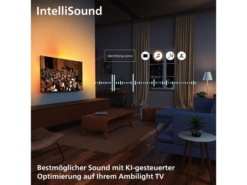 One touch Play, støtte for Apple AirPlay, G-SYNC Compatible, FreeSync Premium, Frame Rate Control (FRC), Sunrise Alarm, Game bar 2.0, tilpasning til veggfargen, CalMAN automatisk og manuell kalibreringsstøtte, Ambilight Suite