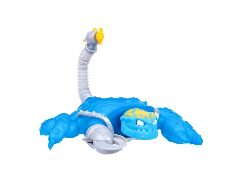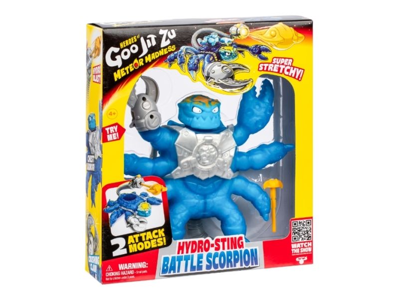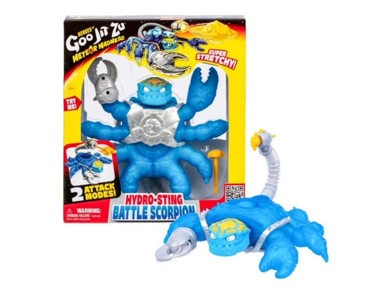 Stretched to the Extreme and coming straight for you! Brace yourself for a meteoric blitz with the all-new Heroes of Goo Jit Zu Meteor Madness: Hydro Sting. This formidable Battle Scorpion is built for relentless combat, equipped with two powerful attack modes. On the ground, he strikes with a crushing attack, using his mighty claws to seize anything in his path. But that’s not all, peeling back his tail, he unleashes an epic Hydro Blast, overwhelming enemies with unstoppable force. Shielded by battle-ready chest armor, Hydro Sting is fully protected, diving headfirst into mayhem without taking damage. When the fight demands a shift, he seamlessly transitions into his secondary attack position, with a pivoting head and dynamic body that lets him switch between crawling and upright stances. At 8.5 inches (21 cm), Hydro Sting is also the ultimate battle mount, with a back saddle compatible with Goo Jit Zu figures. With him leading the charge, check out the other nine Meteor Madness heroes and get ready for epic, gooey mayhem with the new Hydro Sting!