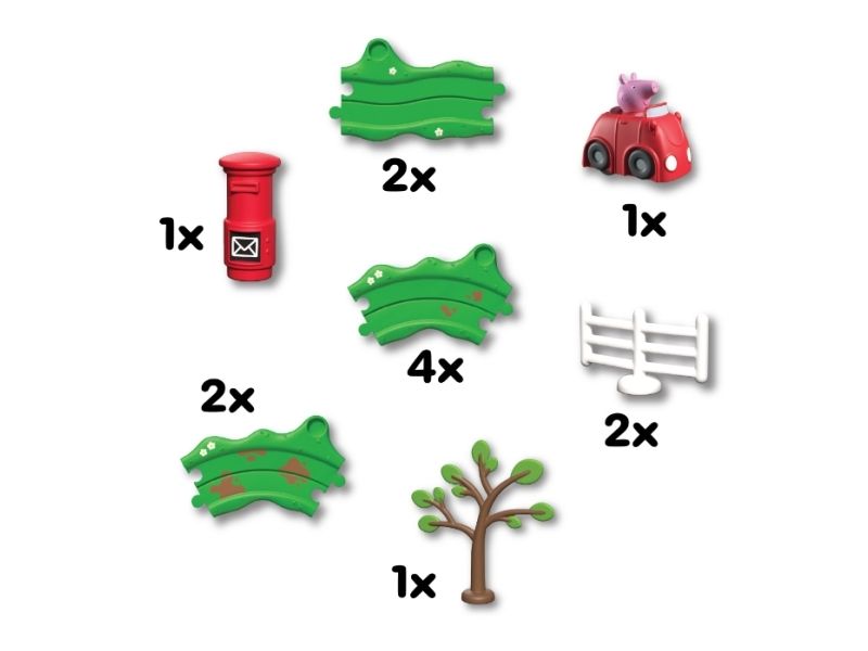 Det lille røde Peppa Pig Whizz-Around bil-sæt indeholder Gurli i den klassiske røde bil, sammen med vejbanespor og tilbehør. Banesættet samles med et simpelt puslespilsystem, som er nemt for små hænder at sætte sammen. Tilpas banen med det medfølgende tilbehør – og tryk så på Gurlis hoved, og se hende køre!