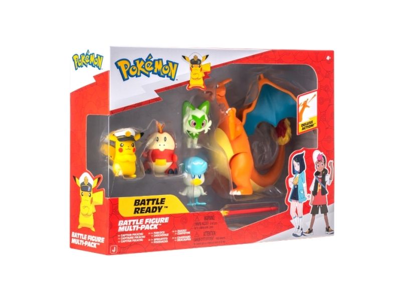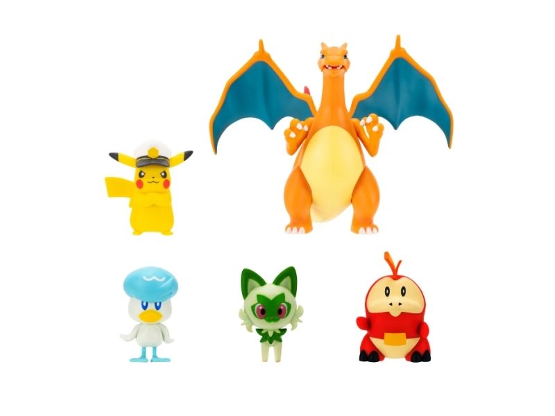 Gjør deg klar til å sette seil med Pokémon Horizons Battle Figure 5-pakken. Følg kaptein Pikachu i spissen, med Sprigatito, Fuecoco og Quaxly med på ferden. Fullfør laget ditt med en Charizard Battle Feature-figur og fyr av hans spesielle ildmissil-angrep. Still ut disse Pokémon-figurene sammen med dine andre Battle Figures og gjør deg klar for eventyr på de syv hav. Offisielt lisensiert Pokémon-produkt fra Jazwares.