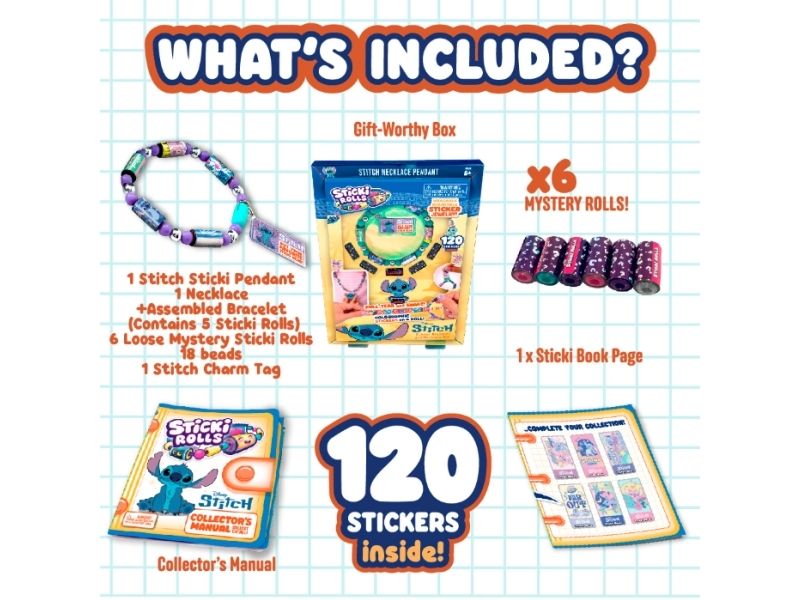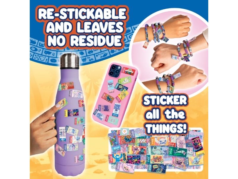Eksklusive Stitch-designs: Indeholder 30 samlerbare Sticki Rolls (300 helt nye klistermærker), der viser Stitch’s legesyge personlighed og tropiske eventyr i Hawaii!