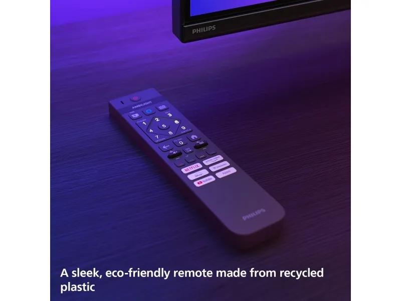 Thoughtful design The sleek, almost bezel-free screen looks great in any room — and Ambilight can create mesmerising mood lighting when the screen's off. The TV remote is made from recycled plastic and our packaging uses FSC-certified recycled cardboard with inserts printed on recycled paper. Philips 85MLED910/12. Display diagonal: 2.16 m (85"), Display resolution: 3840 x 2160 pixels, HD type: 4K Ultra HD, Display technology: QD-Mini LED, Screen shape: Flat. Smart TV. Motion interpolation technology: Perfect Natural Motion, Native aspect ratio: 16:9. Digital signal format system: DVB-C, DVB-S, DVB-S2, DVB-T, DVB-T2, DVB-T2 HD. Wi-Fi. Product colour: Black