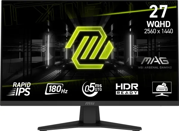 MSI MAG 274QF. Display diagonal: 68.6 cm (27"), Display resolution: 2560 x 1440 pixels, HD type: Wide Quad HD, Display technology: LCD, Response time: 0.5 ms, Native aspect ratio: 16:9, Viewing angle, horizontal: 178°, Viewing angle, vertical: 178°. VESA mounting. Product colour: Black