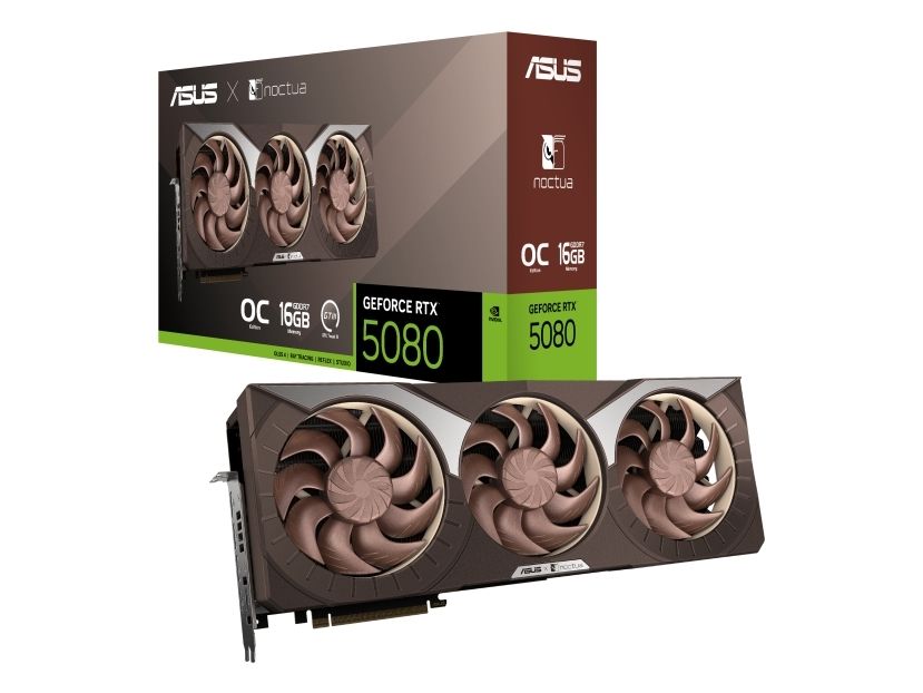The ASUS Noctua OC Edition graphics card delivers performance for gamers and creators alike. With an NVIDIA GeForce RTX 5080 GPU, users can enjoy visuals at a maximum resolution of 7680 x 4320. The 16 GB of GDDR7 SDRAM and a memory speed of 30 Gbps ensure smooth multitasking and efficient handling of multiple demanding applications. This graphics card supports up to 4 monitors and is equipped with features such as NVIDIA DLSS 4, 4th Gen Ray Tracing Cores, and 5th Gen Tensor Cores for enhanced gaming experiences. Its cooling solution, including vapor chamber technology and a triple fan design, ensures optimal thermal performance while remaining silent thanks to 0dB Technology. Players can take advantage of NVIDIA Reflex 2 and NVIDIA Broadcast for a responsive and immersive gaming environment.
