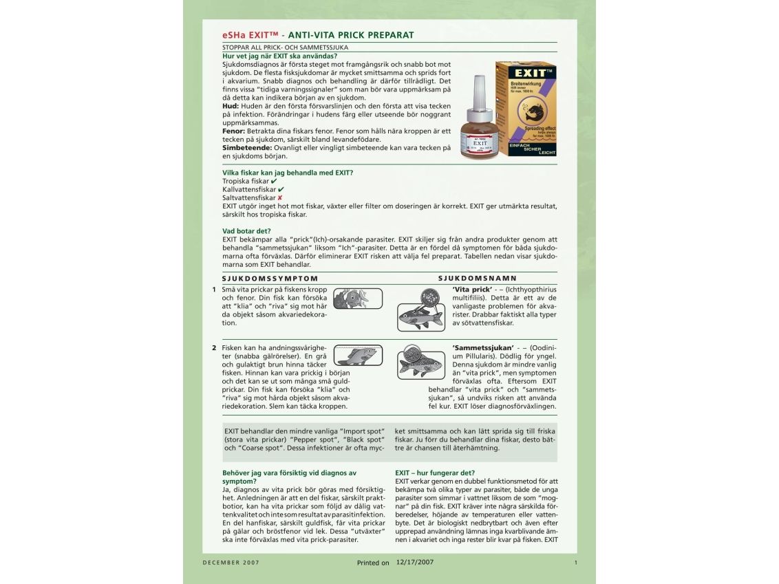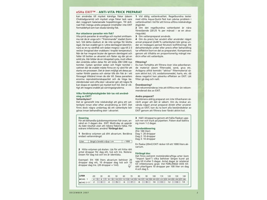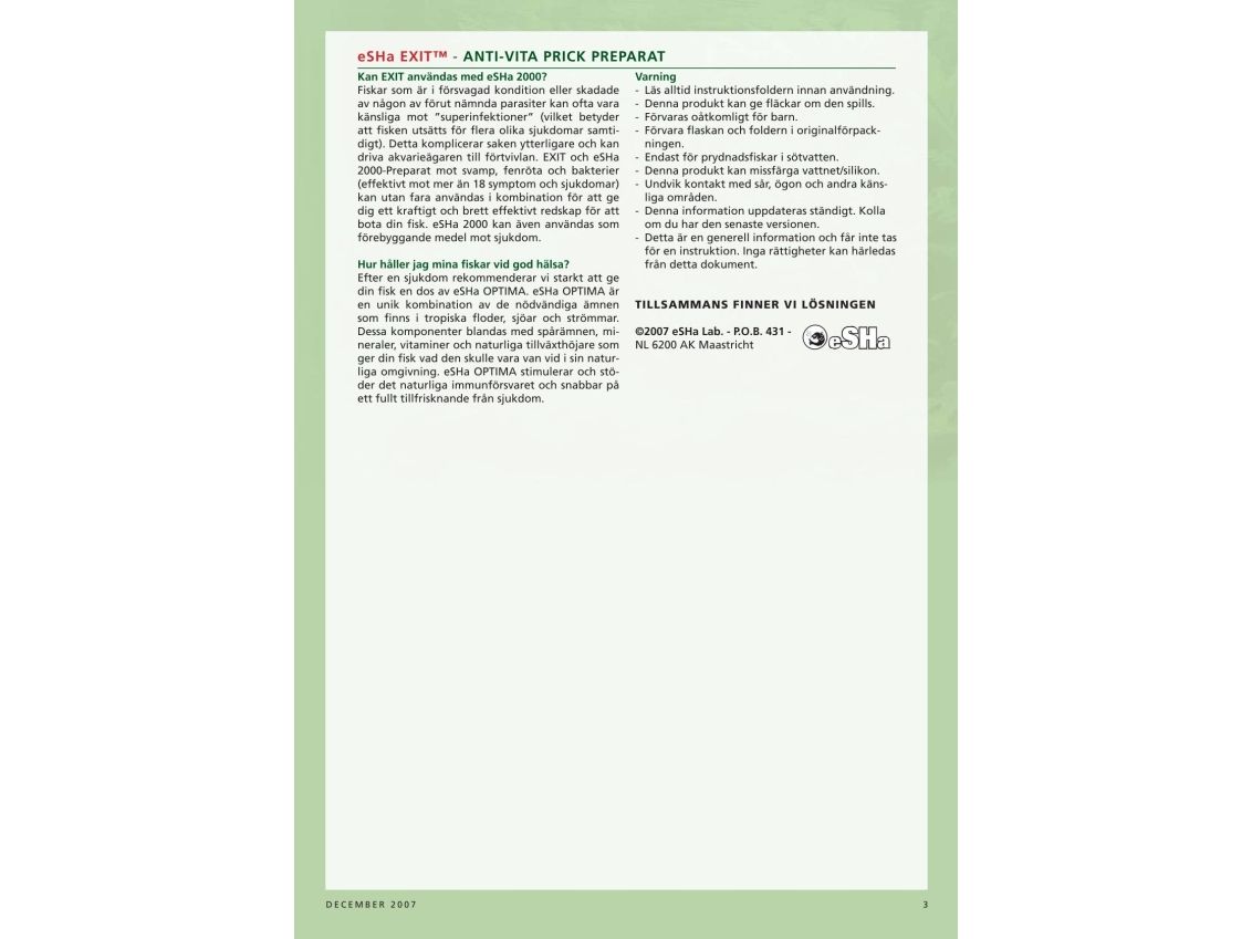 Snabbverkande och skonsam fiskmedicin som behandlar alla pricksjukdomar och sammetssjuka (Ooidium). I kombination med eSHa 2000 ges ett brett, effektivt redskap för att behandla de flesta vanligt förekommande sjukdomarna.