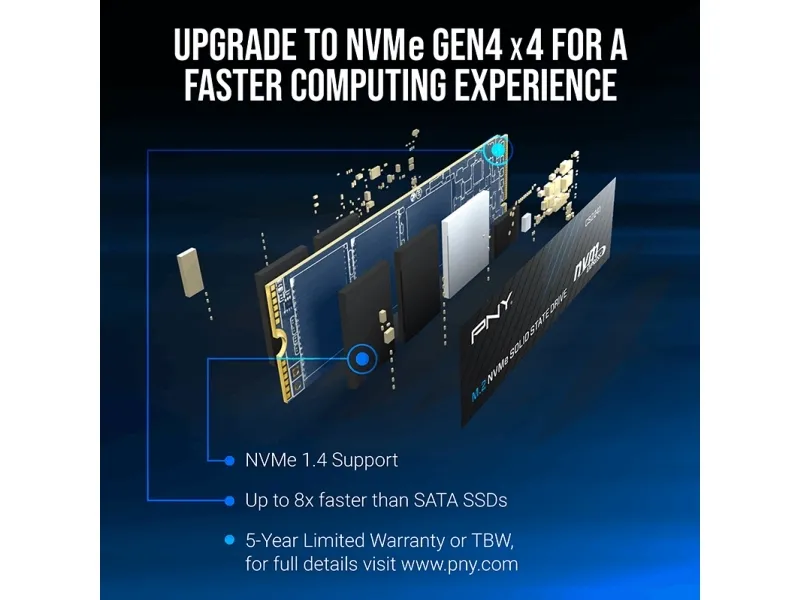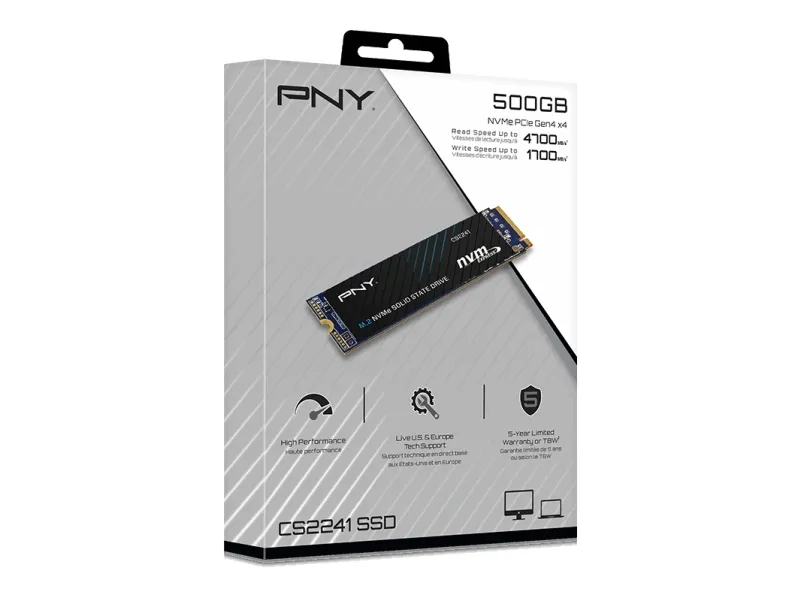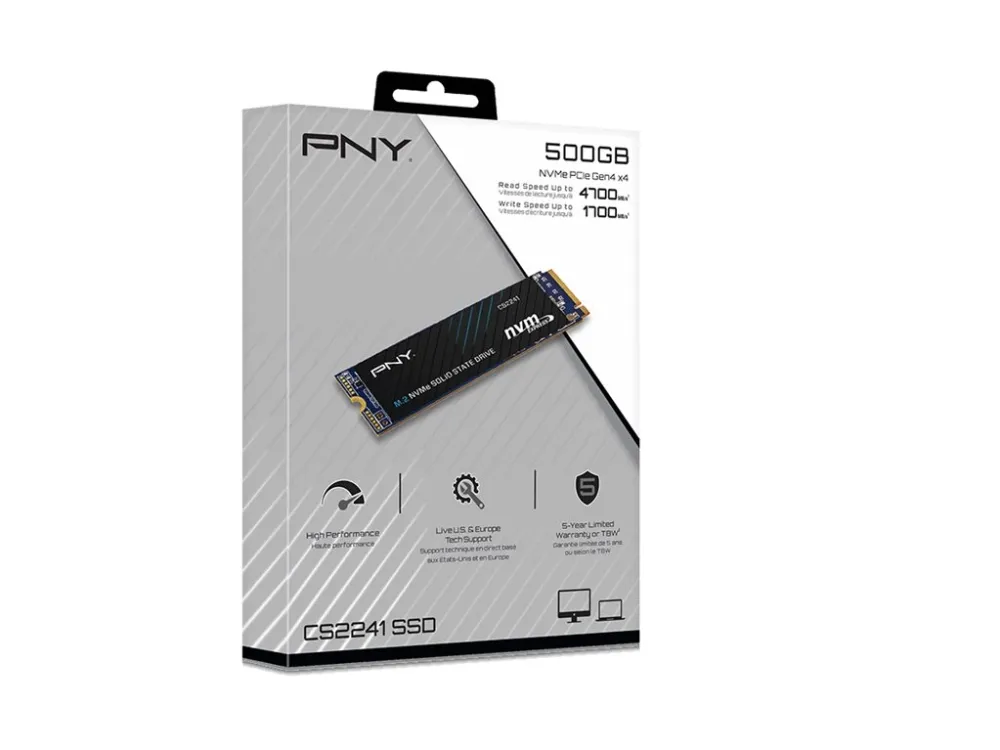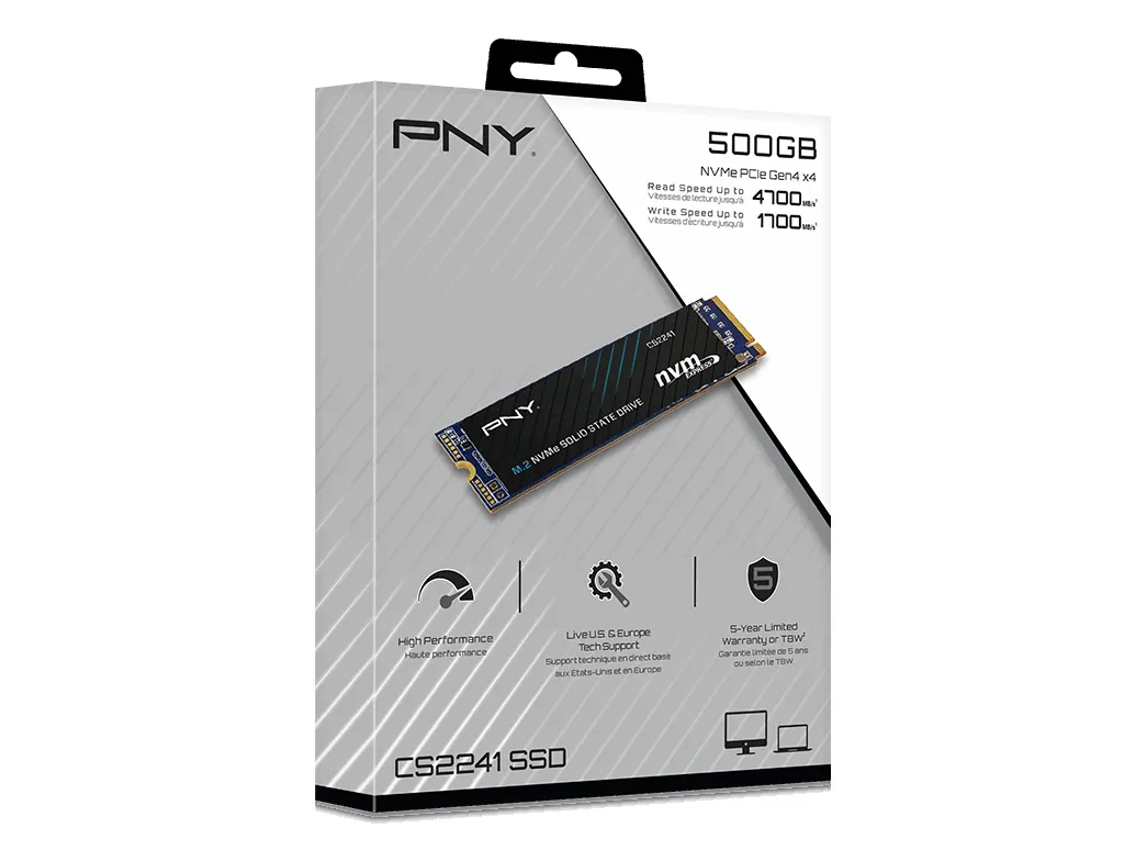 The PNY CS2241 M.2 NVMe Gen4 x4 Solid State Drive is an excellent choice for a mainstream performance upgrade in an NVMe Gen4 enabled desktop or laptop computer. Upgrade to the advanced NVMe technology and experience the enhanced performance of up to 4,700 MB/s seq. read and 1,700 MB/s seq. write speeds. Experience faster boot times, quicker application launches, and improved overall system performance using the CS2241 Gen4 technology. Do more in less time with NVMe Gen4 x4; boot up, power down, and load applications up to 8 times faster compared to SATA based SSD's. Designed to deliver the performance you demand, and with no moving parts, the PNY CS2241 is highly durable, less likely to fail.