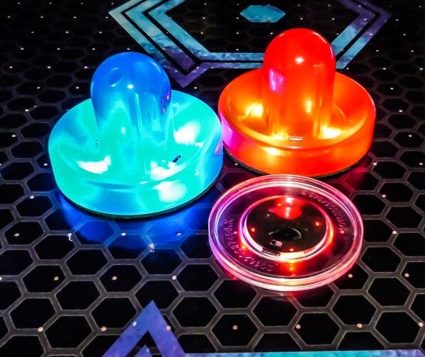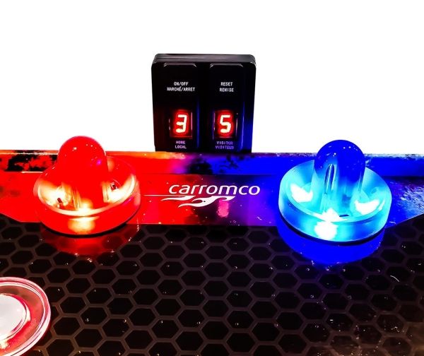 Få arcade-fornemmelse derhjemme med det seje airhockeybord fra Carromco. - Luft der holder pucken svævende - Fede LED-lyseffekter i hjørnerne - Elektronisk scoretavle - LED-puk og - LED-skubbere (oplades med USB-stik)