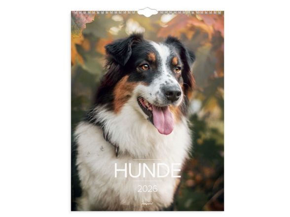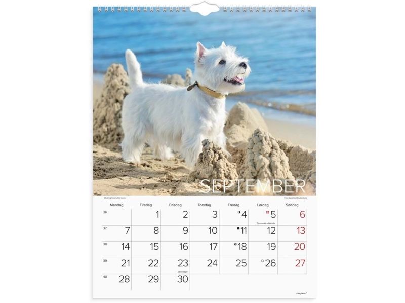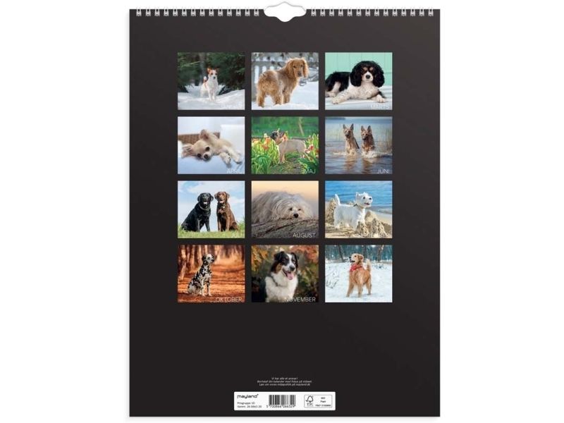 Vægkalender i karton med flotte billeder af hunde. Kalenderen er spiralindbundet og giver dig en oversigt over 1 måned ad gangen med masser af plads til noteringer, så du hurtigt og nemt kan skabe et godt overblik over den enkelte måned.