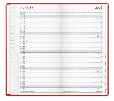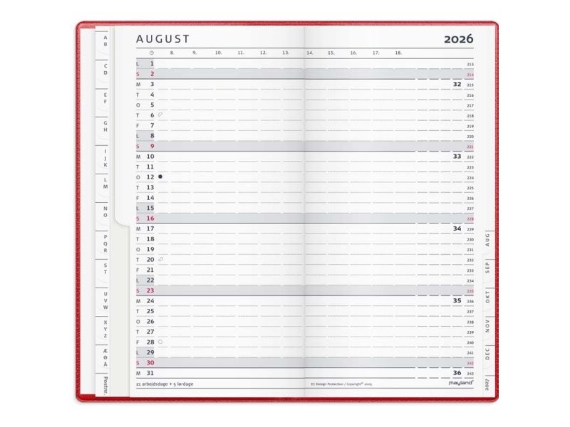 Den originale index planner. Kalenderen er indbundet med et omslag i rød vinyl, som giver kalender et flot og elegant udseende. Kalenderen er inddelt med en måned pr. opslag og indeholder et timeopdelt kalenderskema fra kl. 8-18, så du hurtigt kan danne dig et overblik over månedens planer og aftaler. I bunden af månedsopslagene er der angivet, hvor mange arbejdsdage der er den pågældende måned. Du finder desuden årsoversigter og diverse praktiske informationer til højre i kalenderen, mens du til venstre finder et adresse- og telefonregister. Dertil finder du en praktisk lille notesblok samt plads til 3 kreditkort.