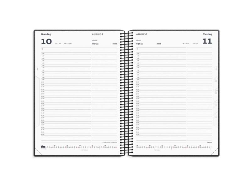 Timekalenderen er spiralindbundet med et omslag i genbrugskarton. Kalenderen er inddelt med en dag pr. side og indeholder et timeopdelt kalenderskema kl. 0.00-23.00 og har en halvtimeinddeling i tidsintervallet 8-19. Dertil finder du en tidslinje og månedsoversigt nederst på hvert opslag, udfoldelig årsoversigter, speciel noteringskolonne, hjørneperforering og månedsregister, som sikrer hurtige opslag, samt en lomme til løse papirer bagerst i kalenderen.