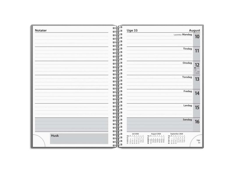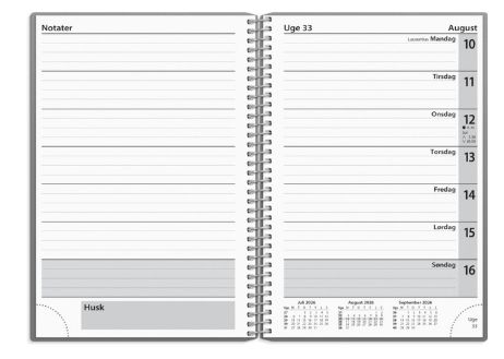 Struktureret ugekalender. Kalenderen er spiralbundet med et omslag i hård PP-plast, som gør kalenderen nem at bladre i. Kalenderen er inddelt med en uge pr. opslag og indeholder et klassisk kalenderskema i tværformat på højre side og en notatside på venstre side. Herved har du mulighed for løbende at skrive noter og huskelister til ugen. Dertil finder du en udfoldelig årsoversigt, et kalenderleksikon, månedlige regnskabsark og postnumre.