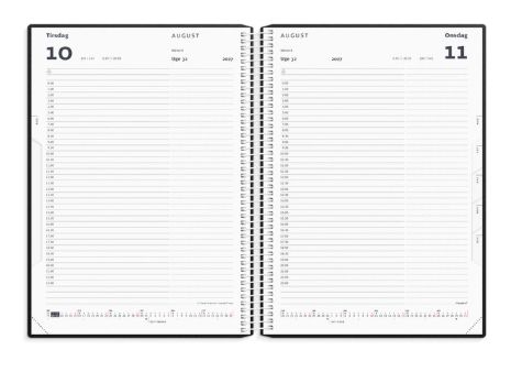 Timekalenderen er spiralindbundet med et omslag i hård PP-plast. Kalenderen er inddelt med en dag pr. side og indeholder et timeopdelt kalenderskema kl. 0.00-23.00 og har en halvtimeinddeling i tidsintervallet 8-19. Dertil finder du en tidslinje og månedsoversigt nederst på hvert opslag, udfoldelig årsoversigter, speciel noteringskolonne, hjørneperforering og månedsregister, som sikrer hurtige opslag, samt en lomme til løse papirer bagerst i kalenderen. Fås i to årgange.
